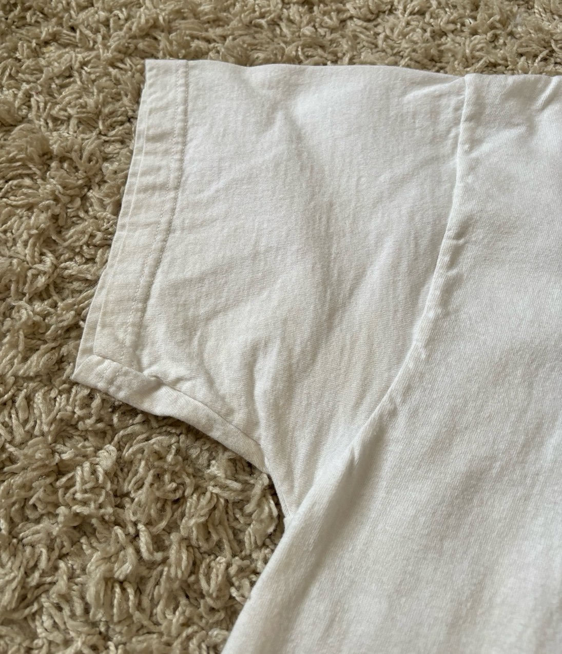 Shirt is in overall great condition but does have a very light stain on the front (hard to notice) and one small mark on the right shoulder. Could probably come out, see pictures for details