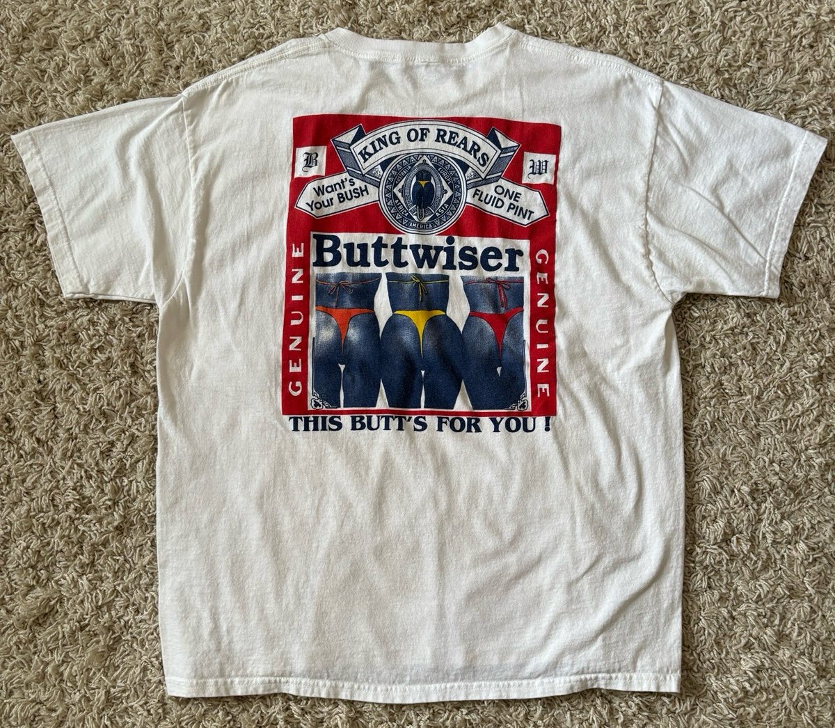 Vintage 90s Buttwiser "King Of Rears" Graphic Parody Budweiser T Shirt XL White