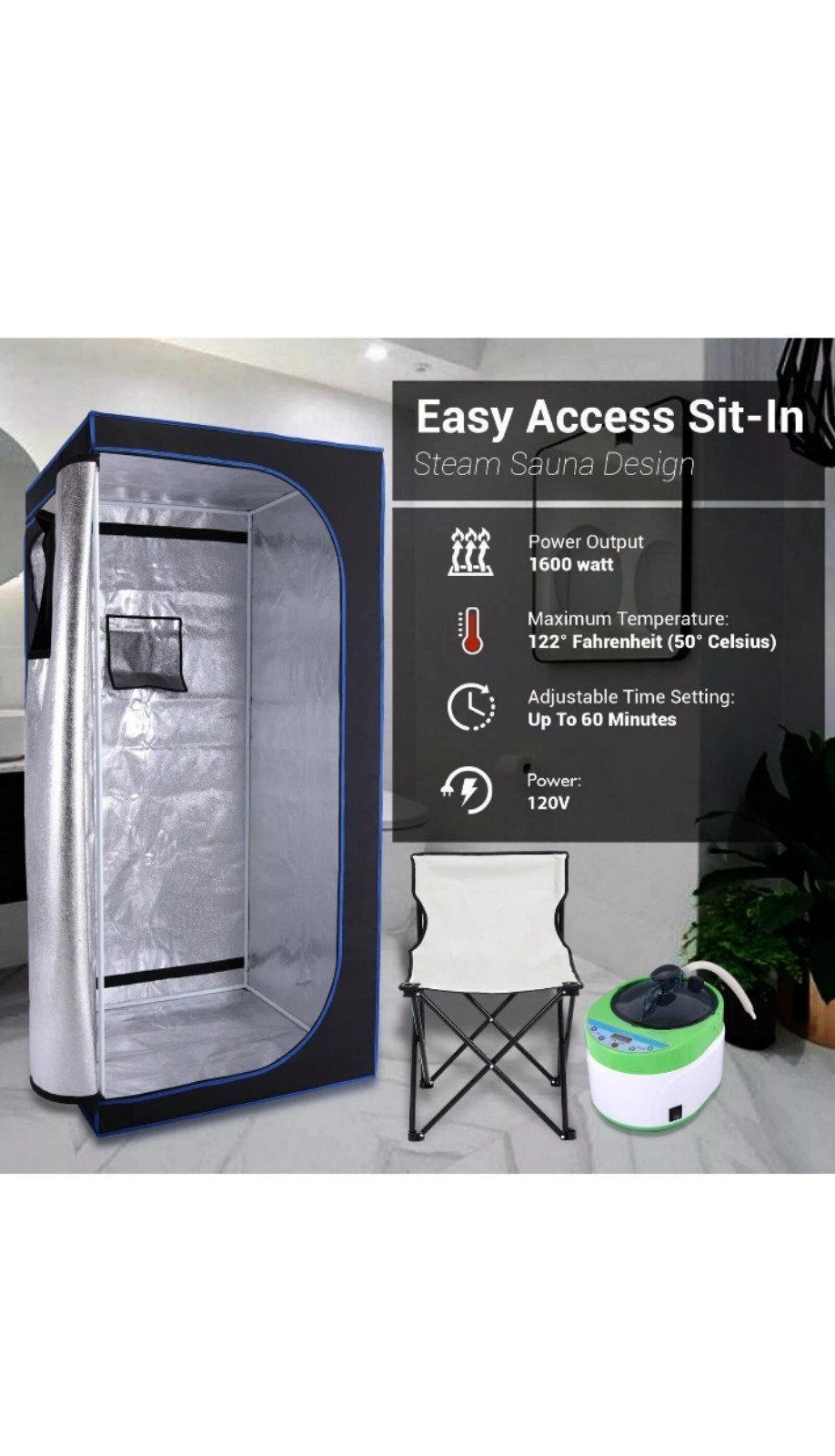 With a seating capacity of 1-3, this wet steam sauna is perfect for small gatherings or individual use. The item length is 35.4 inches, width is 35.4 inches, and height is 78.7 inches. The unit is designed for indoor installation and box has only been opened once.