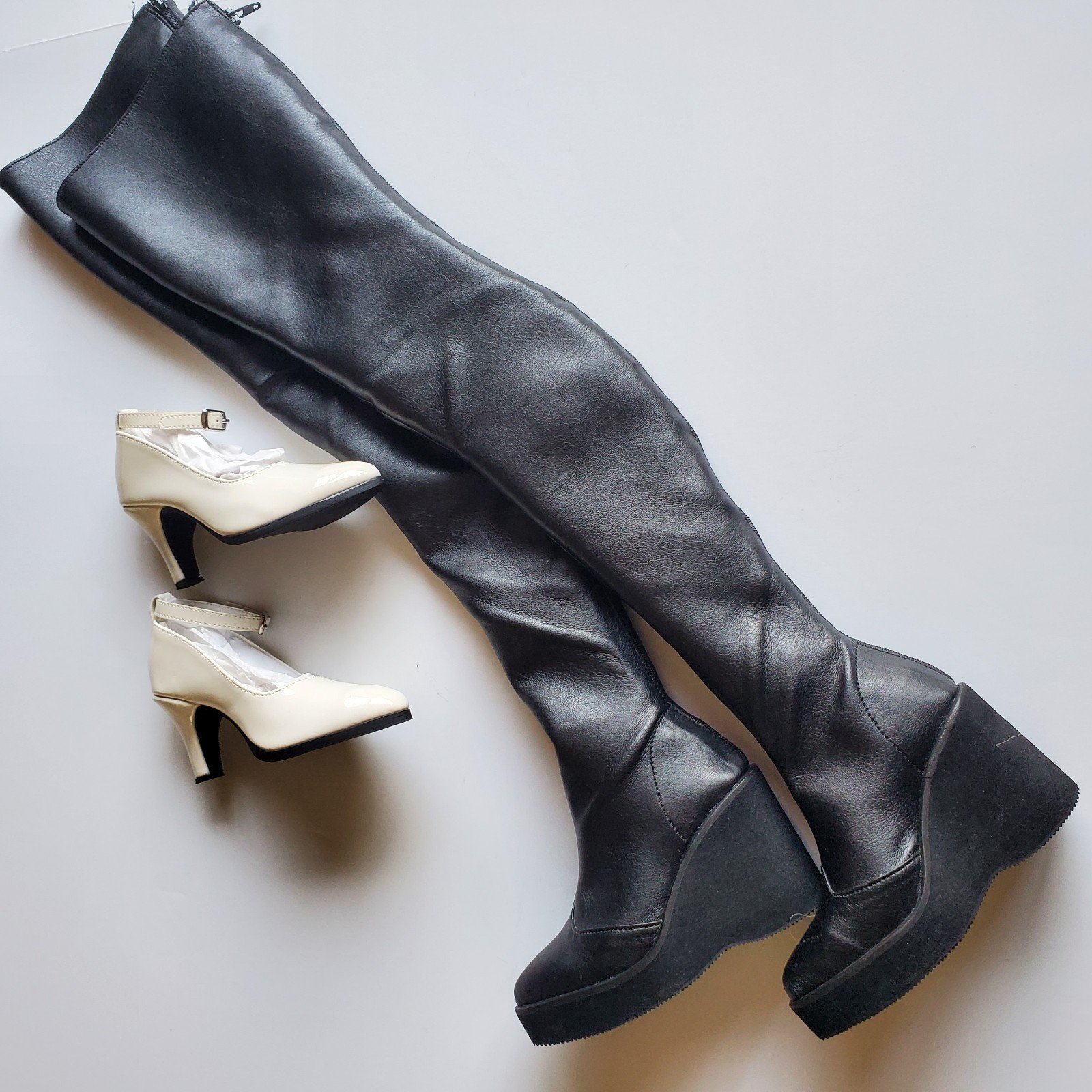Lot of two pairs of shoes for the very large 1/2 scale Dollmore Trinity girl dolls with high heel feet. Will not fit any other dolls to my knowledge. Long black pleather thigh high boots and off white enamel high heels with an ankle strap. Used with minor wear such as as creases in the pleather and toe marks in the white heels. Sold as so please look at photos carefully and ask any questions. Comes from smoke free home and ships free.