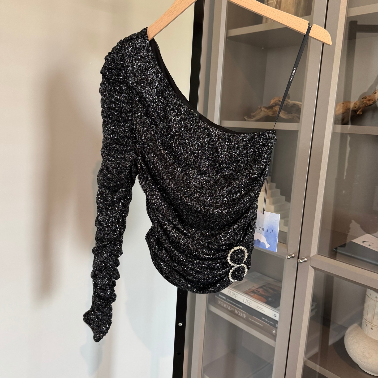 MAJORETTE ELLIANA SILVER GLITTER SPARKLE ONE SLEEVE RHINESTONE DETAIL TOP