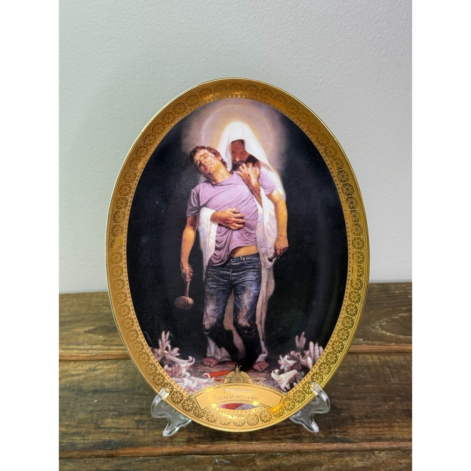 The "Forgiven" Collector Plate from The Masterpeace Collection by Thomas Blackshear II is a beautifully crafted porcelain piece that showcases the artist's signature style. Featuring a multicolor design with a theme of faith, this oval-shaped plate is a decorative collectible that adds a touch of vintage charm to any home. Made in the USA during the late 20th century, this art porcelain piece with a diameter of 8" is a unique and meaningful addition to any collection.
