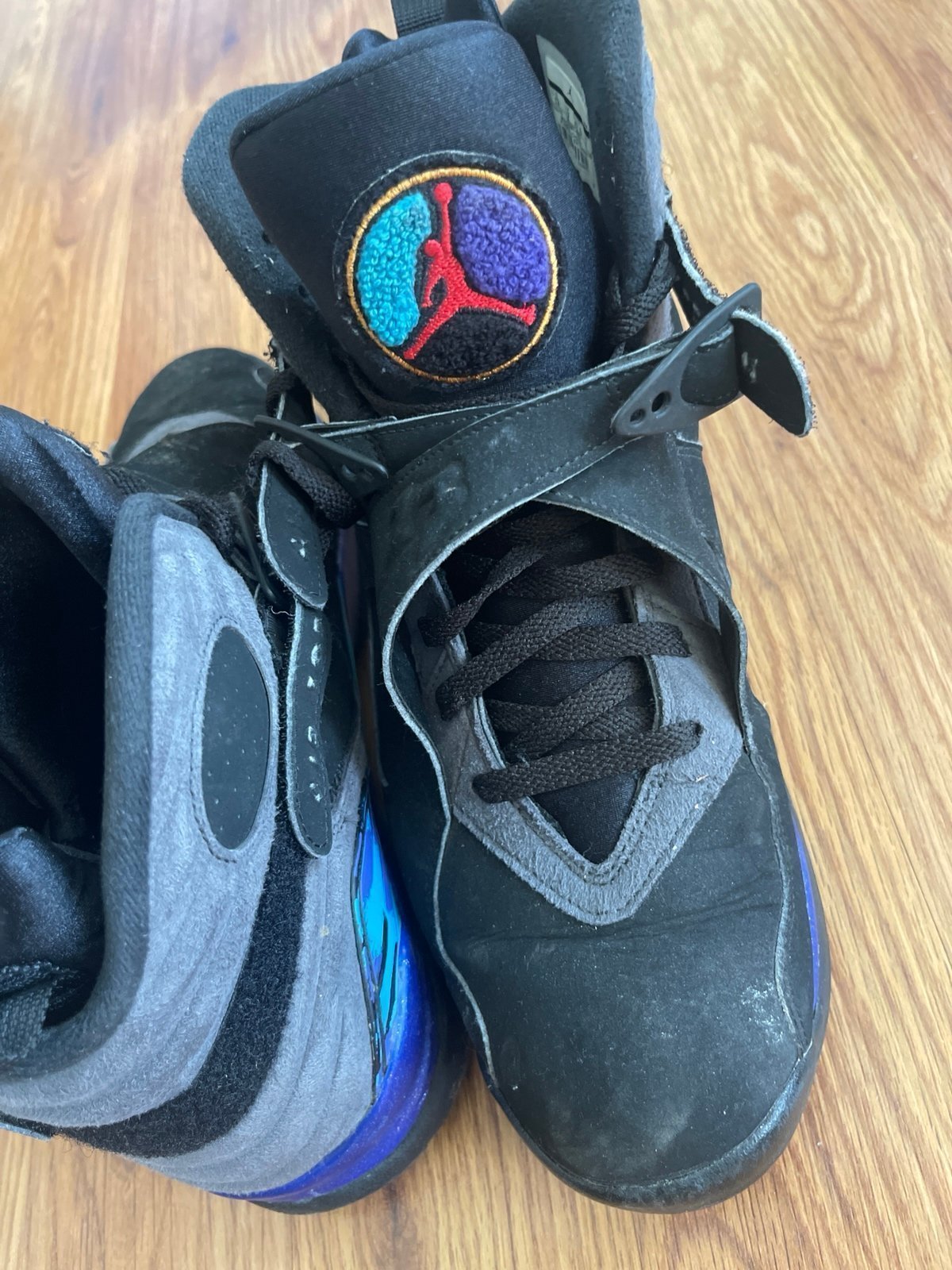 Jordan 8 aqua (2015) release . Fully functional mens size 13.. the shoe are in very good shape for being a 2015 release. maybe a little dirt and wear on one part of the bottom .. these are authentic Jordan’s.. I do not have the original box.. these are a classic Jordan silloettee… any other questions feel free to message me. Thanks