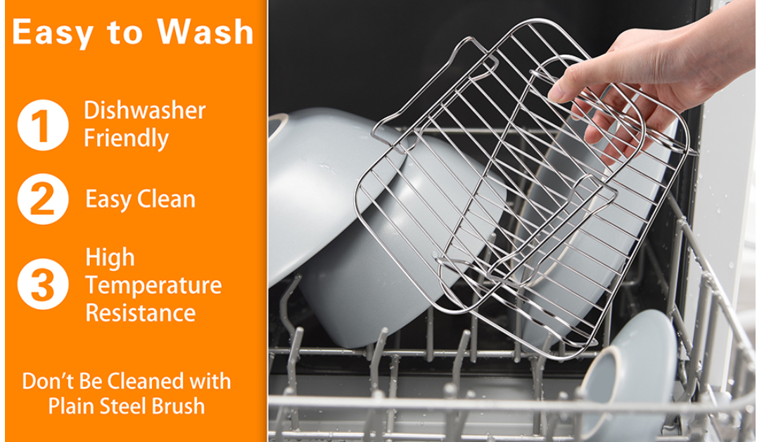 The air fryers rack surface is smooth that grilled food residue won’t get stuck onto the kabob skewer and rack. After each time’s use, just let these grilling skewers sit in warm water, hand wash with gentle detergent or threw them in dishwasher, wipe away water and keep in dry place, and they’ll come out as new.