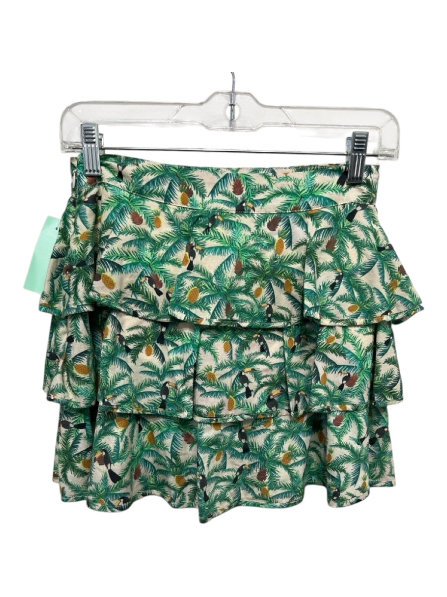 Farm Rio Size XS Green, Beige & Multicolor Cotton Jungle Tiered Mini Skirt