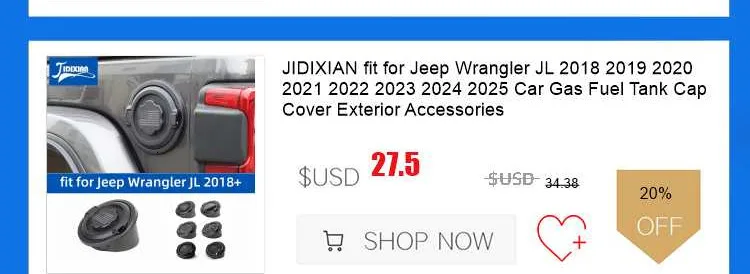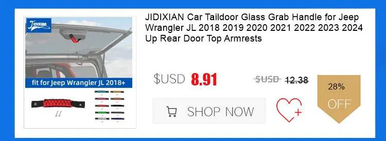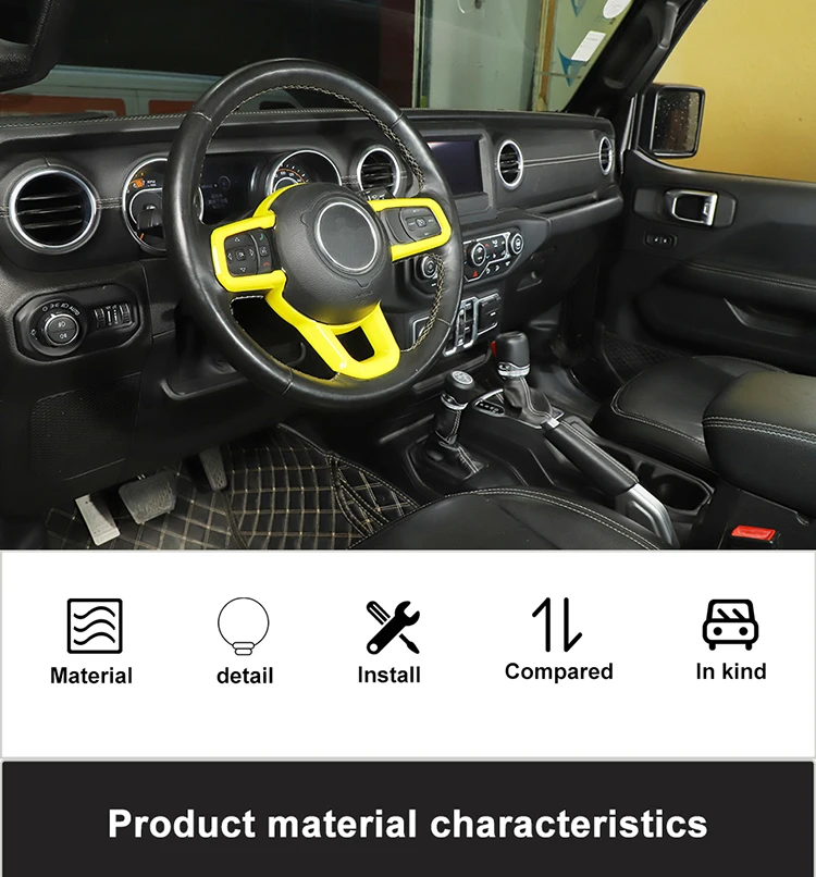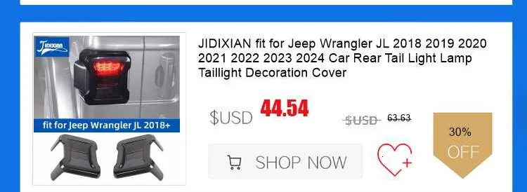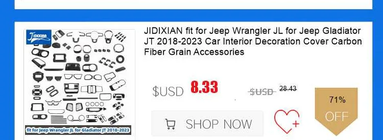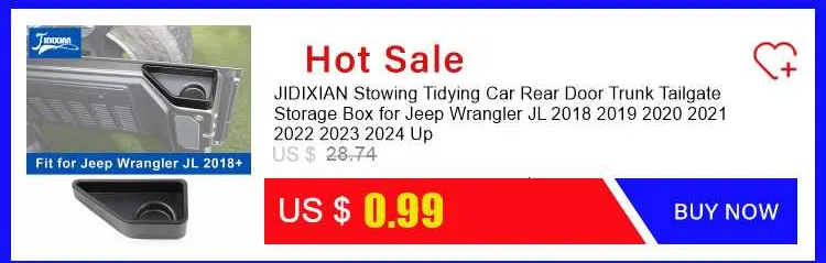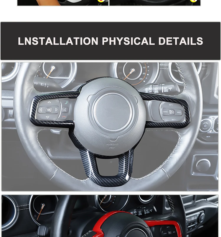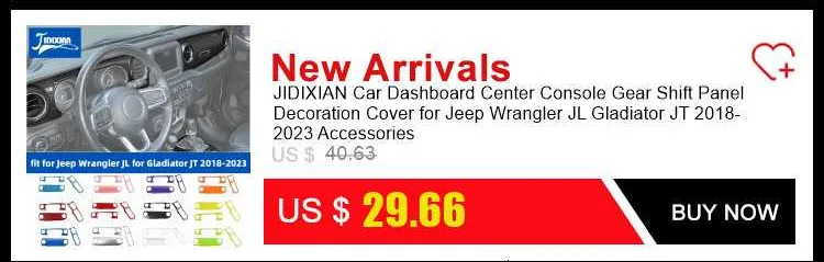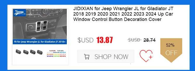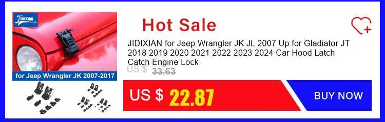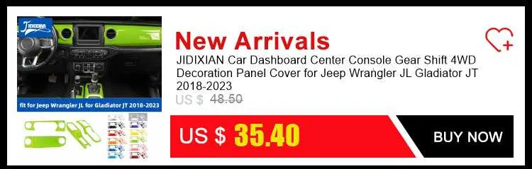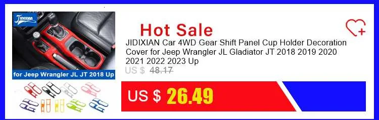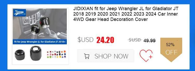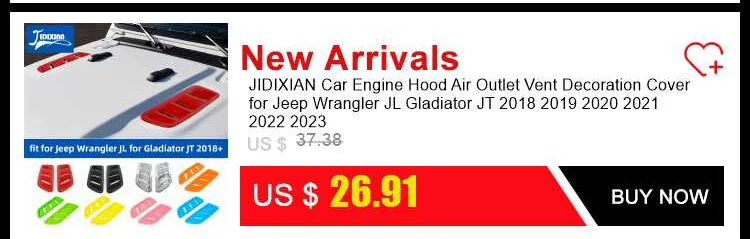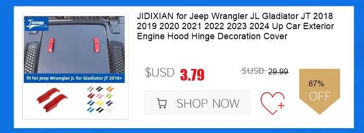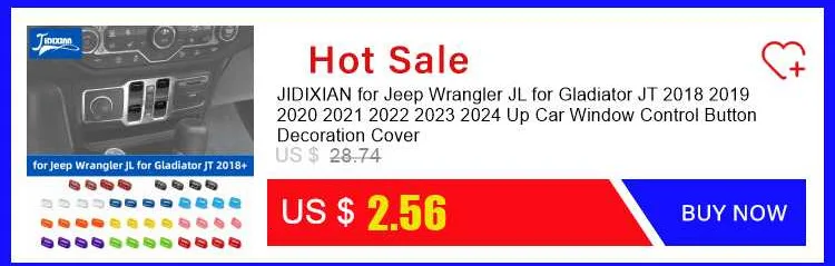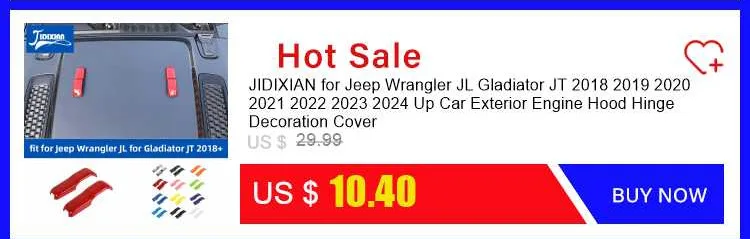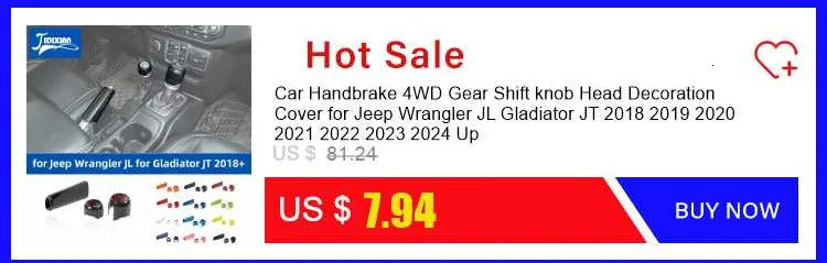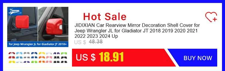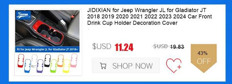 Specification 1. Car Model: fit For Jeep Gladiator JT 2018 2019 2020 2021 2022 2023 224 Up / For Jeep Wrangler JL 2018 2019 2020 2021 2022 2023 2024 Up 2. Color: Black,Red,Silver,Carbon fiber grain,orange,blue,light green,pink,yellow,white 3. Material: ABS plastic 4. Net Weight: 40 g 5. Package Include: 1 pcs 6. 100% Brand New with High Quality. 7. Decorate your car charming luxury vivid. Instructions:(with double-sided tape on the back of item) Step 1: Please clean the place and make sure no dust. Step 2: Remove the double-sided tape in back. Step 3: Heat the double-sided tape by hot air gun or hair dryer; (A tip for putting on with supplied double-sided tape is to warm the product this makes the glue on the tape more sticky.) Step 4: Install the products in the right place,After installation, wait for about 1 minute, let the product paste thoroughly and then release the hand.Don't wash your car within 48 hours. Note: 1. Please check whether this item can fit on your car before purchasing. 2. If you have any questions, please feel free to contact us.