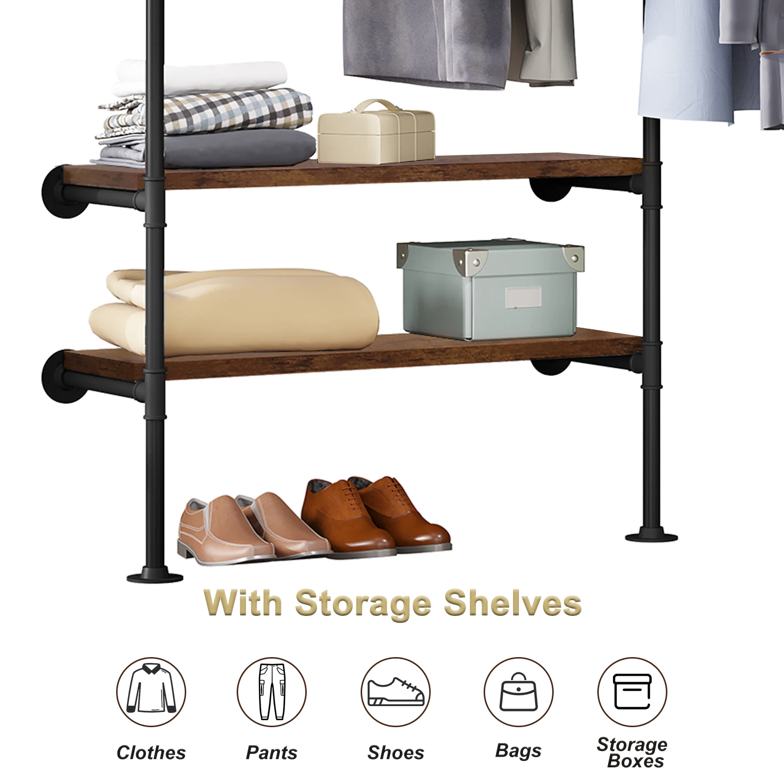 WOLTU Wall-Mounted Clothes Rack Hanger Steel Tube Coat Rack 2 Shelves Industrial Vintage Wardrobe for Bedroom Cloakroom Home