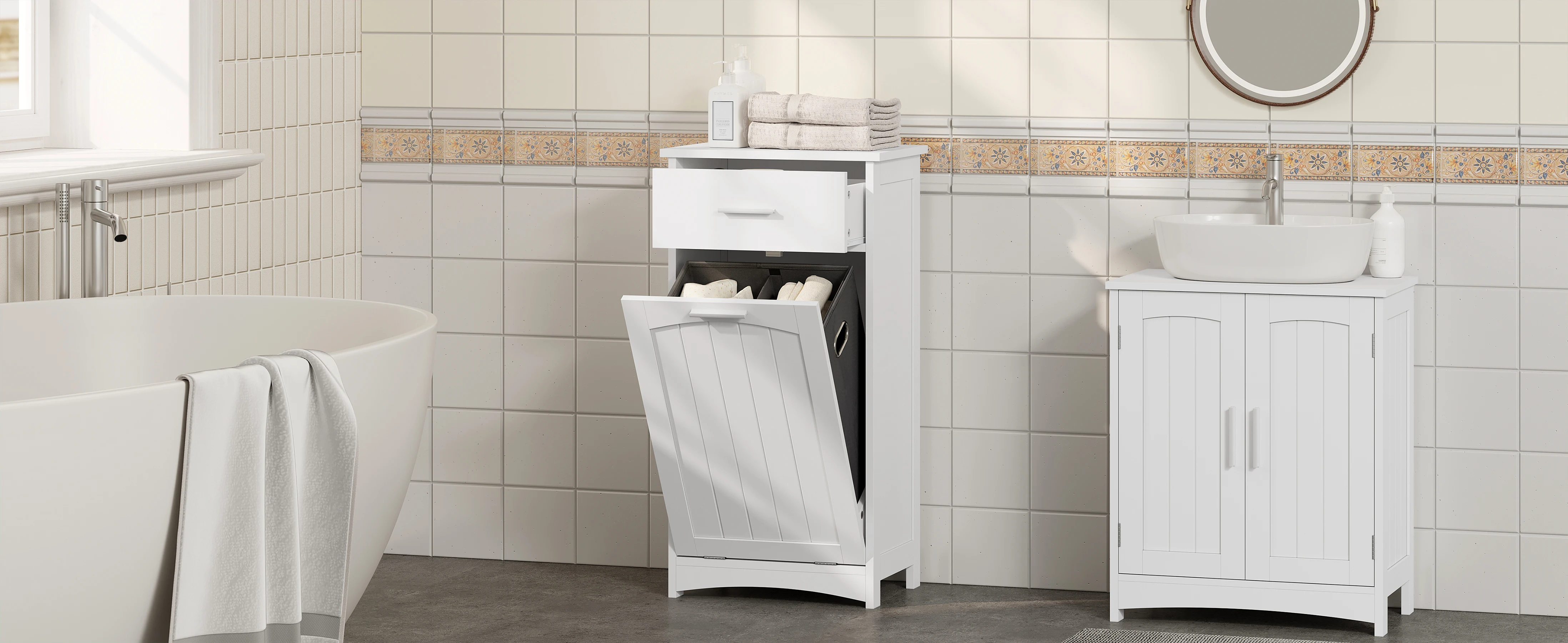 Vast Storage Space: You can place objects on the bathroom storage cabinet tray. 1 drawer allows you to store items. 1 hidden and partitioned laundry basket can hold dirty laundry. Add order to your bathroom