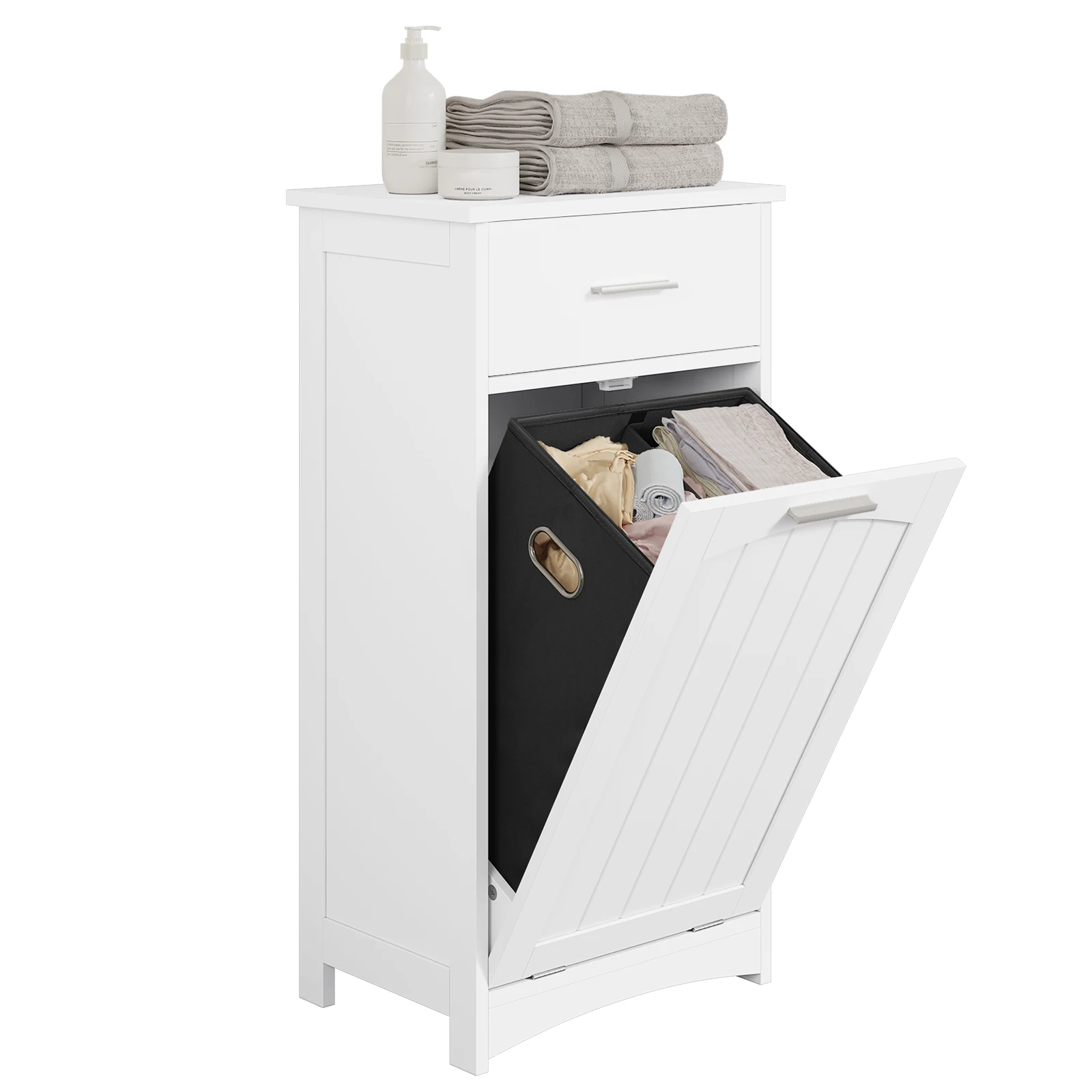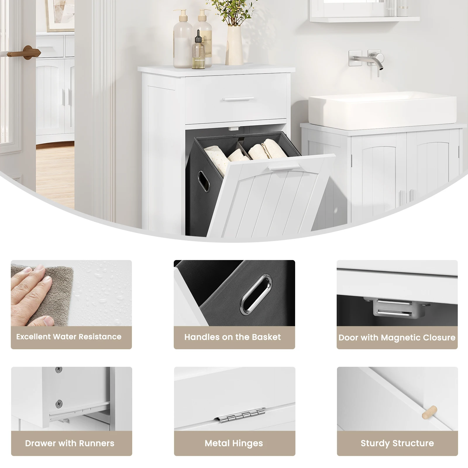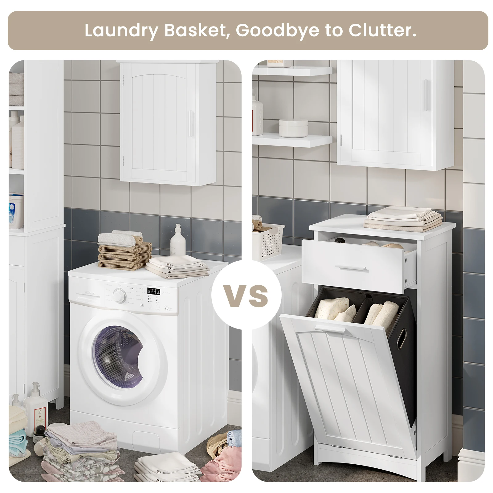 Hidden Laundry Hamper: The fabric laundry bin is behind the door to hide clutter. The removable partition in the middle allows you to organize clothes. The 2 side handles make it easy to remove the basket for cleaning clothes