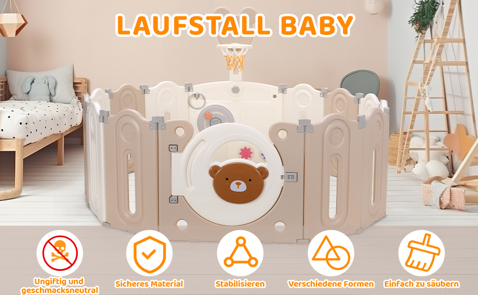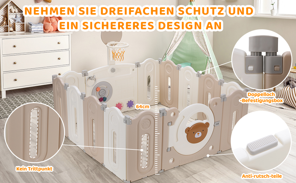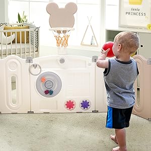 Multiple fun modes: this baby playpen is equipped with sensory toys and a basketball frame to encourage your child to play independently. Playpen toy provides visual and tactile movement. The basketball stand can train children's motor skills, promote muscle training and effectively train children's leg strength. The height of 64 cm is also suitable as a support for babies and toddlers when learning to walk.