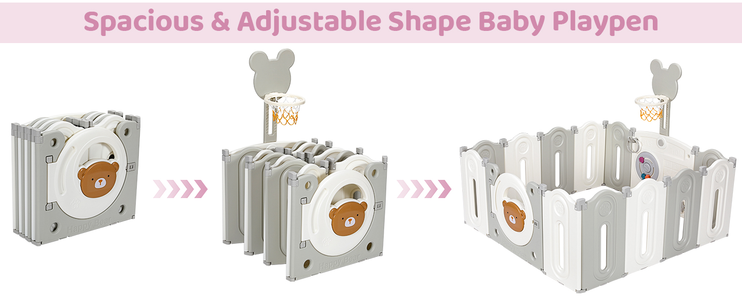 The baby playpen features a foldable design that allows you to manipulate the panels into circles, squares, rectangles, hexagons or octagons and move them into any position you want.