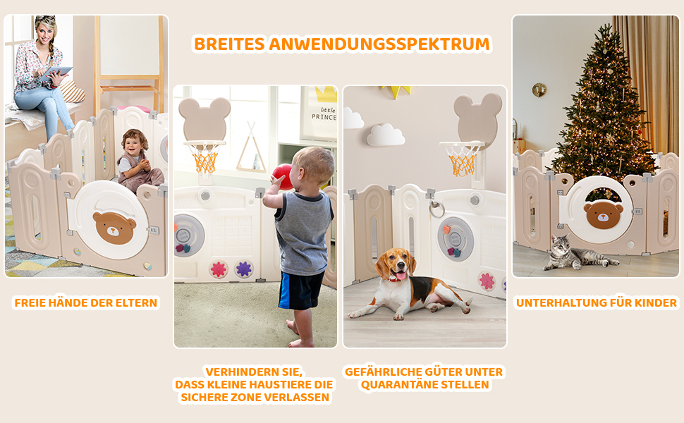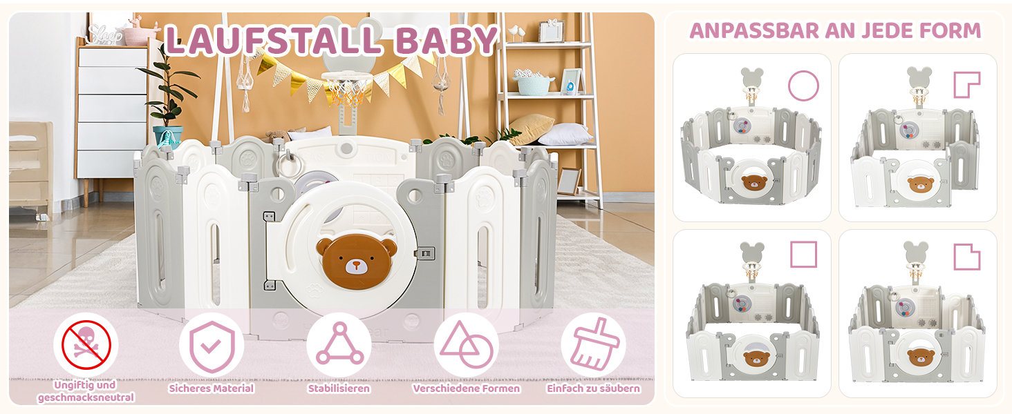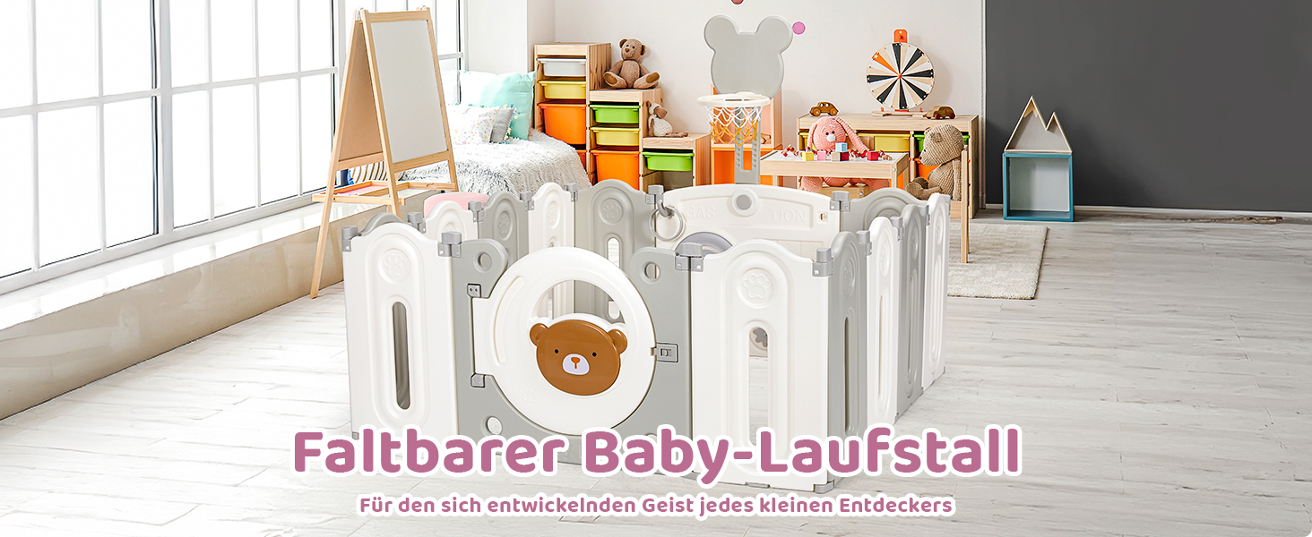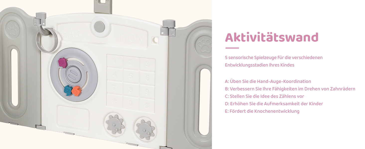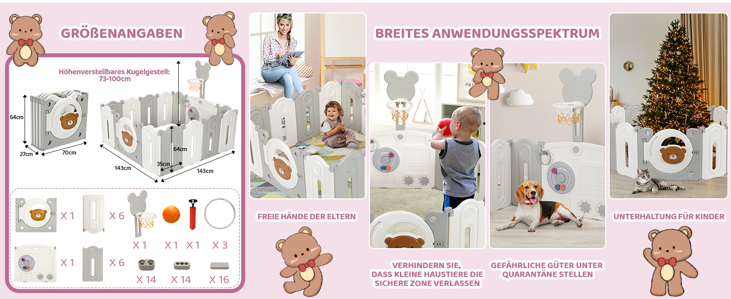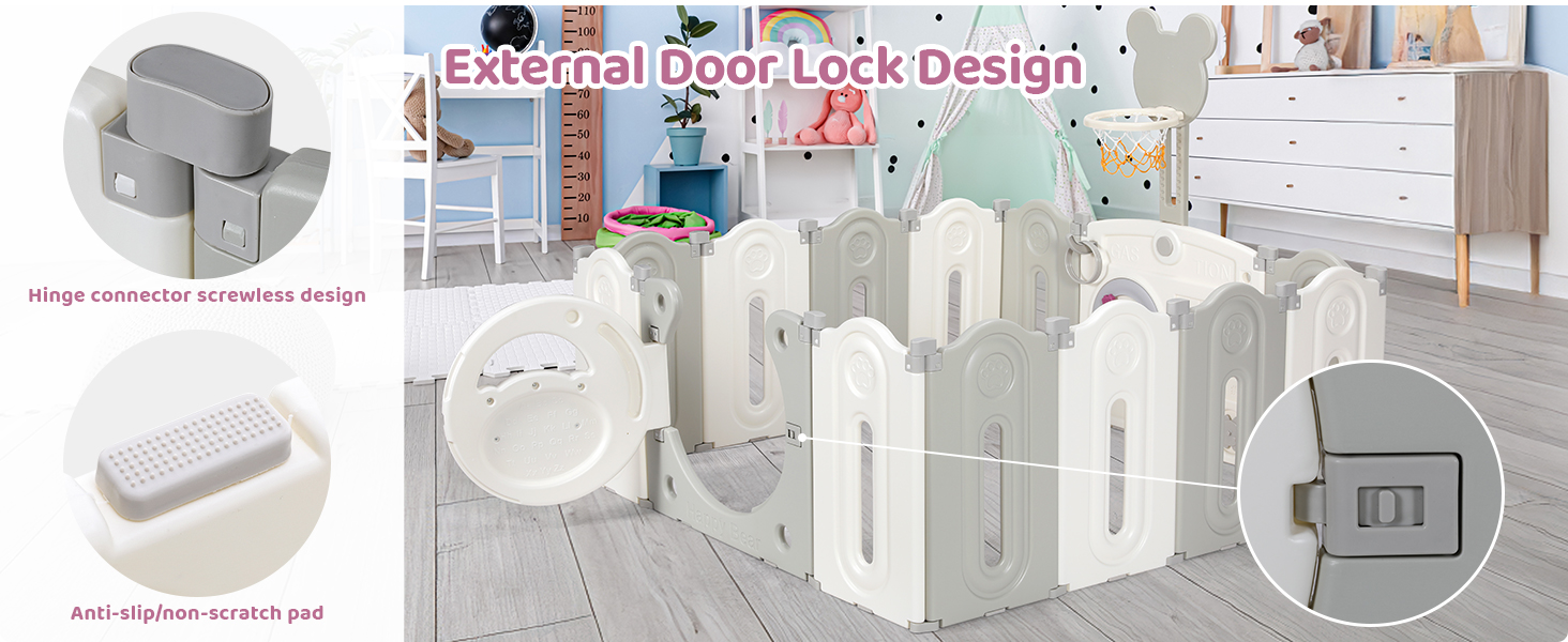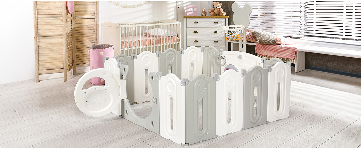 The fence is equipped with game and learning boards and basketball hoops, which are not only beautiful but also educational. The game board can promote the baby's brain development, develop visual perception, exercise hands.