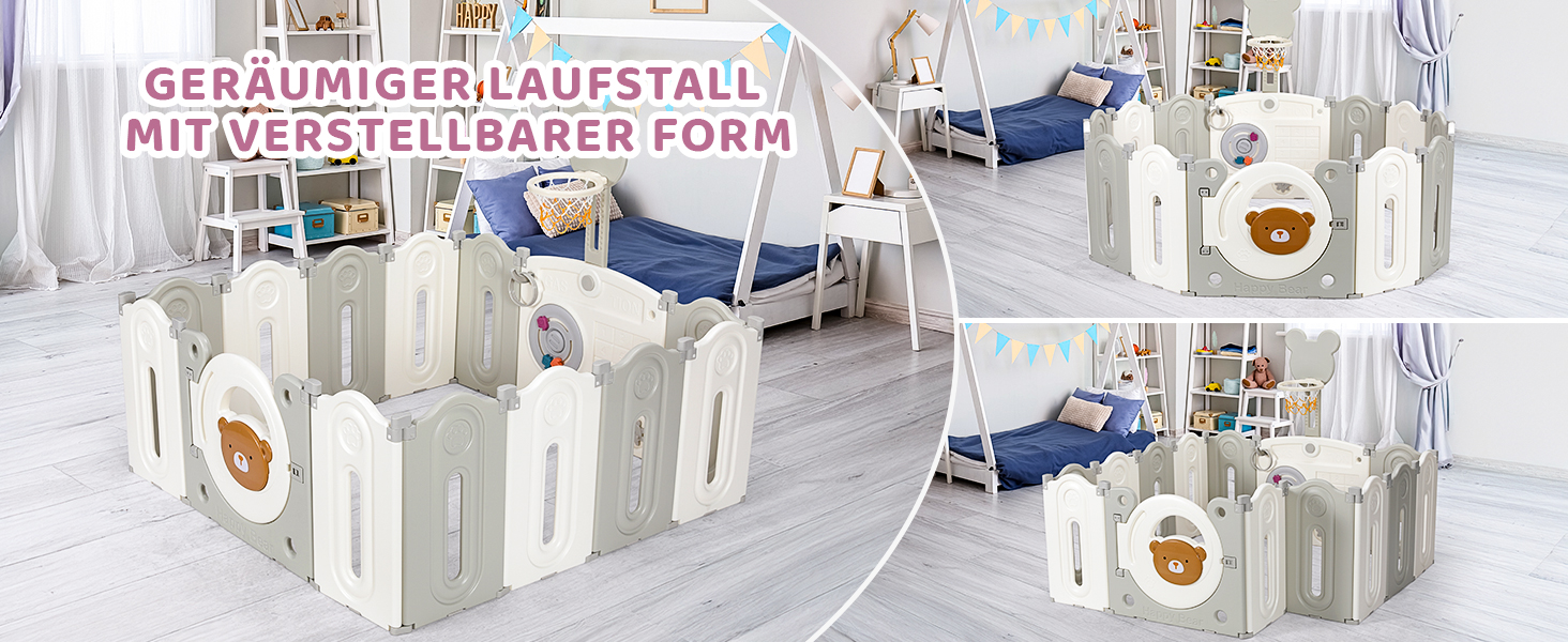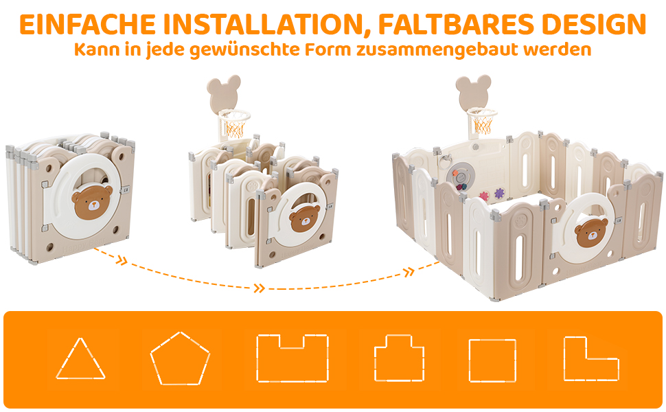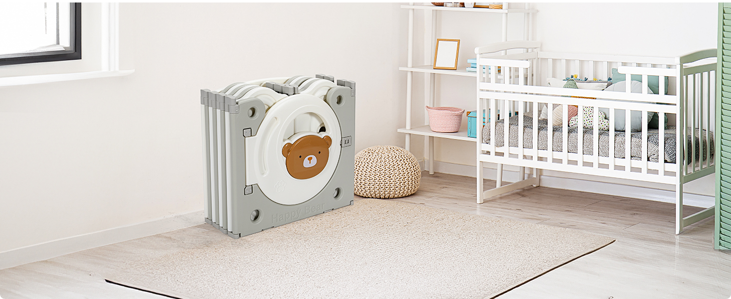 Adjustable shapes: the baby playpen has a foldable design that allows you to manipulate the panels into circles, squares, rectangles, hexagons or octagons and move them to any position. The folded playpen can also be stored in the boot of a car. At the same time, baby fences can also be installed in gardens and yards as small play areas for children. Can also be used as a barrier on stairs, rooms or other surfaces.