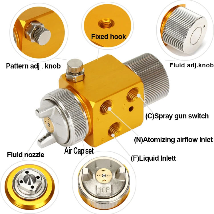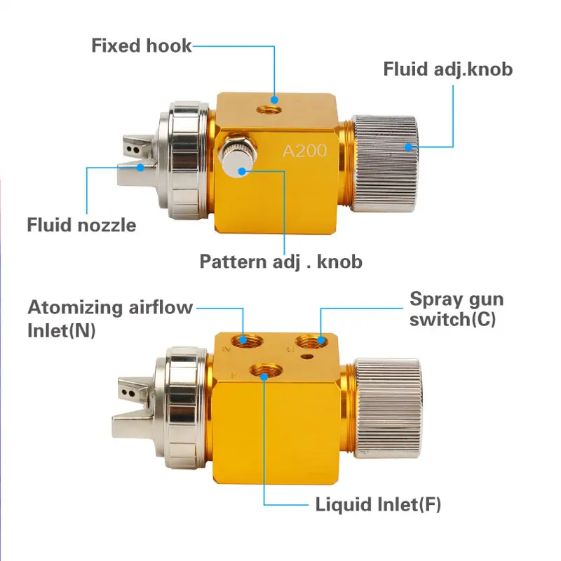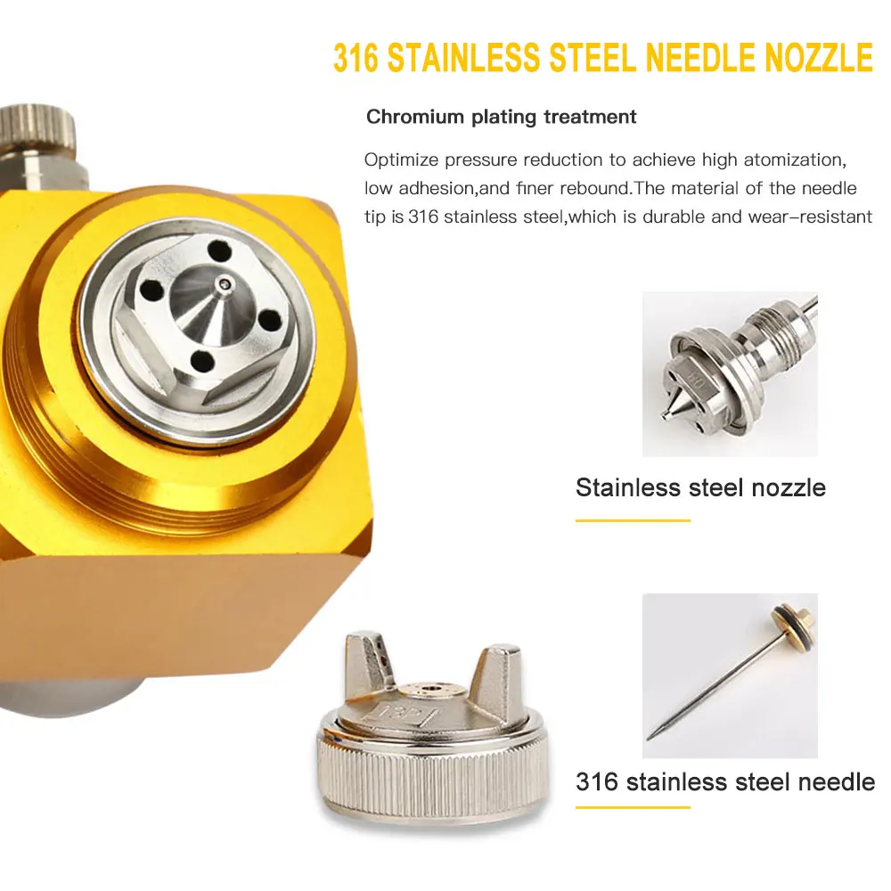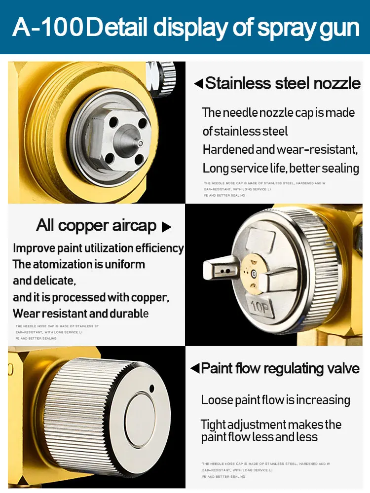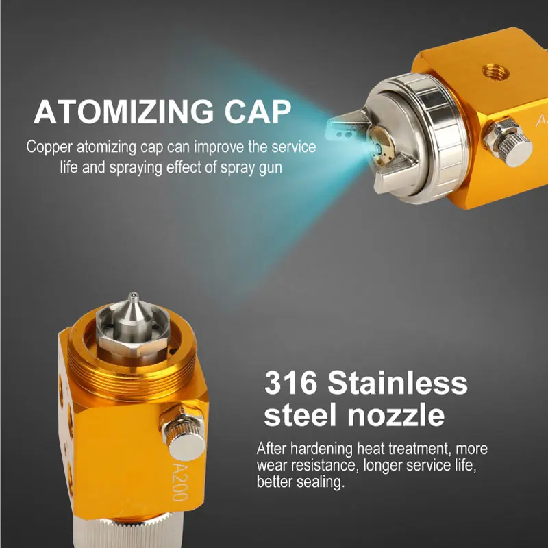 3. High atomized pure copper air cap, with more delicate and even atomization technology. The all aluminum forged gun body and all metal anodizing process of the gun body make it easy to cope with various severe environments, durable, easy to clean, and not deformed.