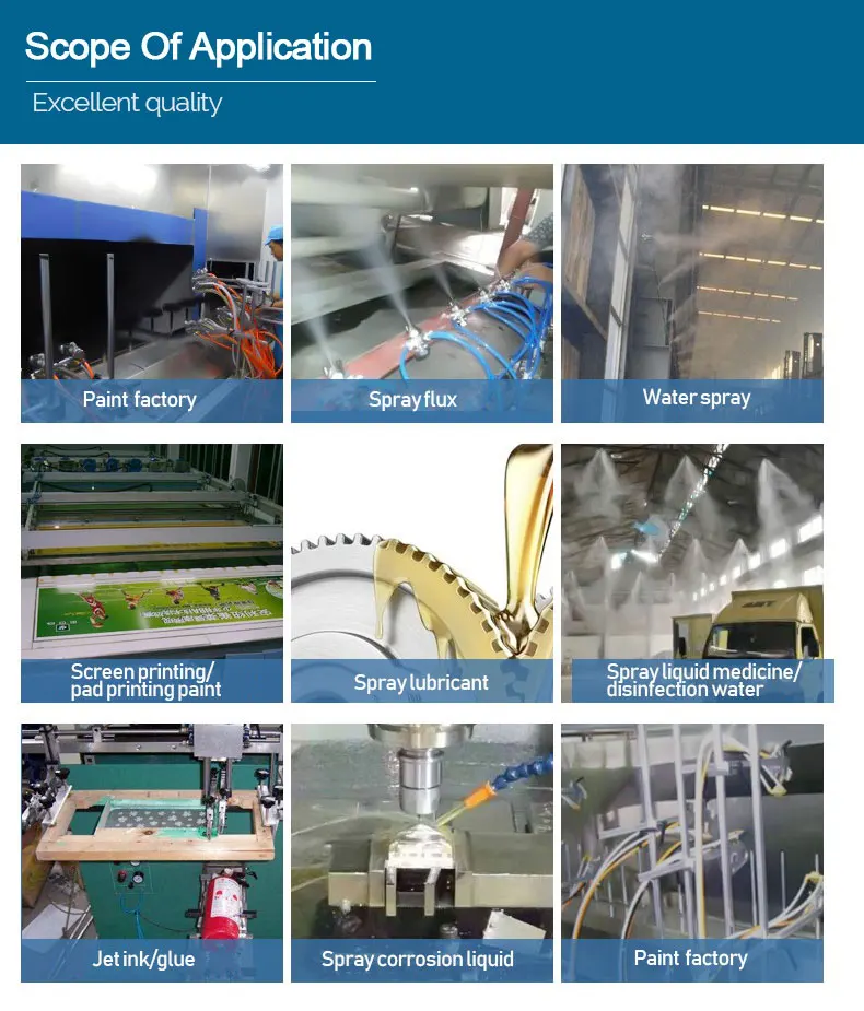 1. Large flow, fine high atomization, large spray amplitude at low pressure, strong adhesion, no air leakage and no liquid leakage. It is widely used in various water-soluble products such as flux, wave soldering, ink, paint, air treatment, etc.