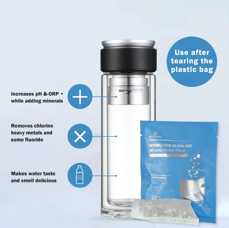 ENJOY ALKALINE WATER ANYWHERE, ANYTIME - With our portable alkaline water filter pouch, you can easily transform any bottle into an alkaline water bottle filter or normal water flask or cup. It's small, lightweight, and the alkaline filter pouch can be used with any type of bottle and cup, ensuring you have access to filtered, pH- enhanced water wherever you are!