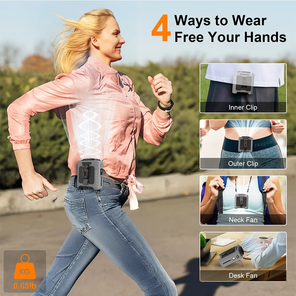 【Waist Fan/Neck Fan/Desk Fan 3 in 1】: It's a portable USB fan with a multifunction - waist clip on fan, necklace fan, desk fan. When you work outside or for outdoor activities, take this portable fan and you'll get all the necessities.