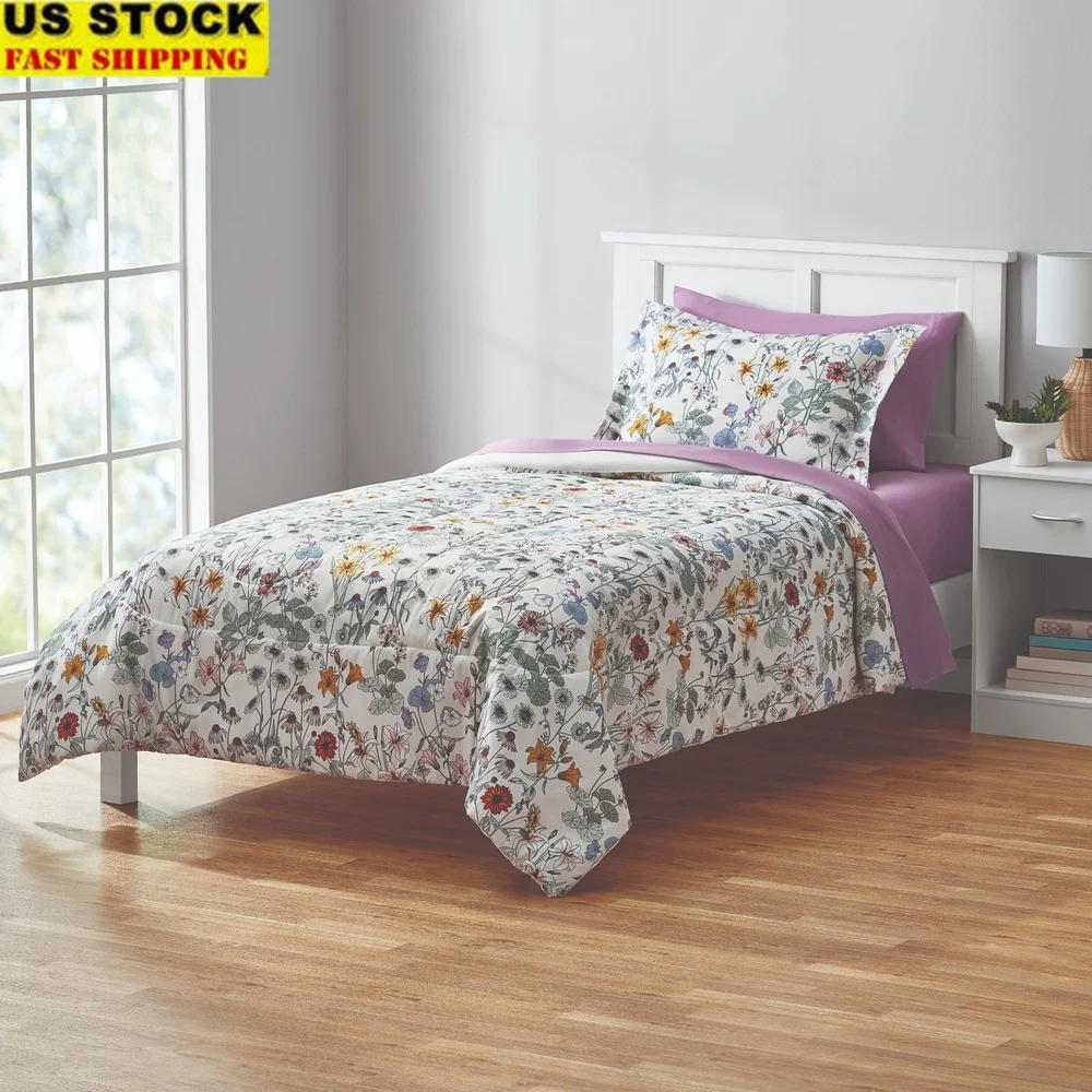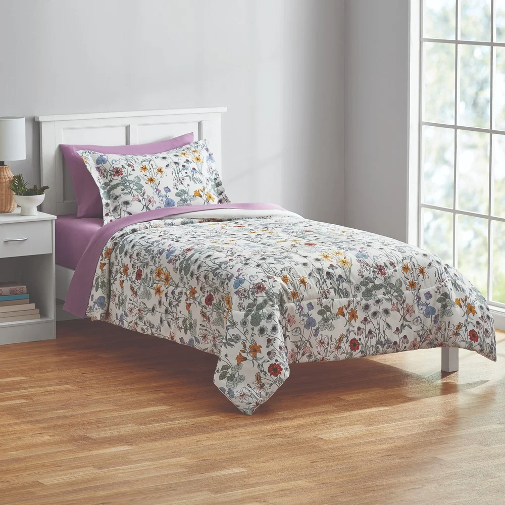 The floral pattern reversible Bed-in-a-Bag Comforter Set has everything you need to make your bed cozy and colorful from top to bottom. The adult, unisex reversible comforter allows you to change your look anytime you want, featuring a floral print in a vibrant color scheme including pink, teal, green, brown, and red on one side, and a solid vanilla color on the other side. This complete set includes a comforter, matching pillow shams (twin set includes 1 sham) and a coordinating solid soft purple sheet set. The bedding set comes with a cloth storage bag for effortless storage when not in use. Available in Twin/Twin XL, Full, Queen and King sizes so you have plenty of options to make this bedding set work in your home. Sewn-through channel quilting keeps the lofty comforter fill evenly distributed, ensuring the perfect fluff to keep you warm during any season. All pieces in this Bed-in-a-Bag Comforter set are made from an incredibly soft polyester, and are machine washable, making them easy to care for.