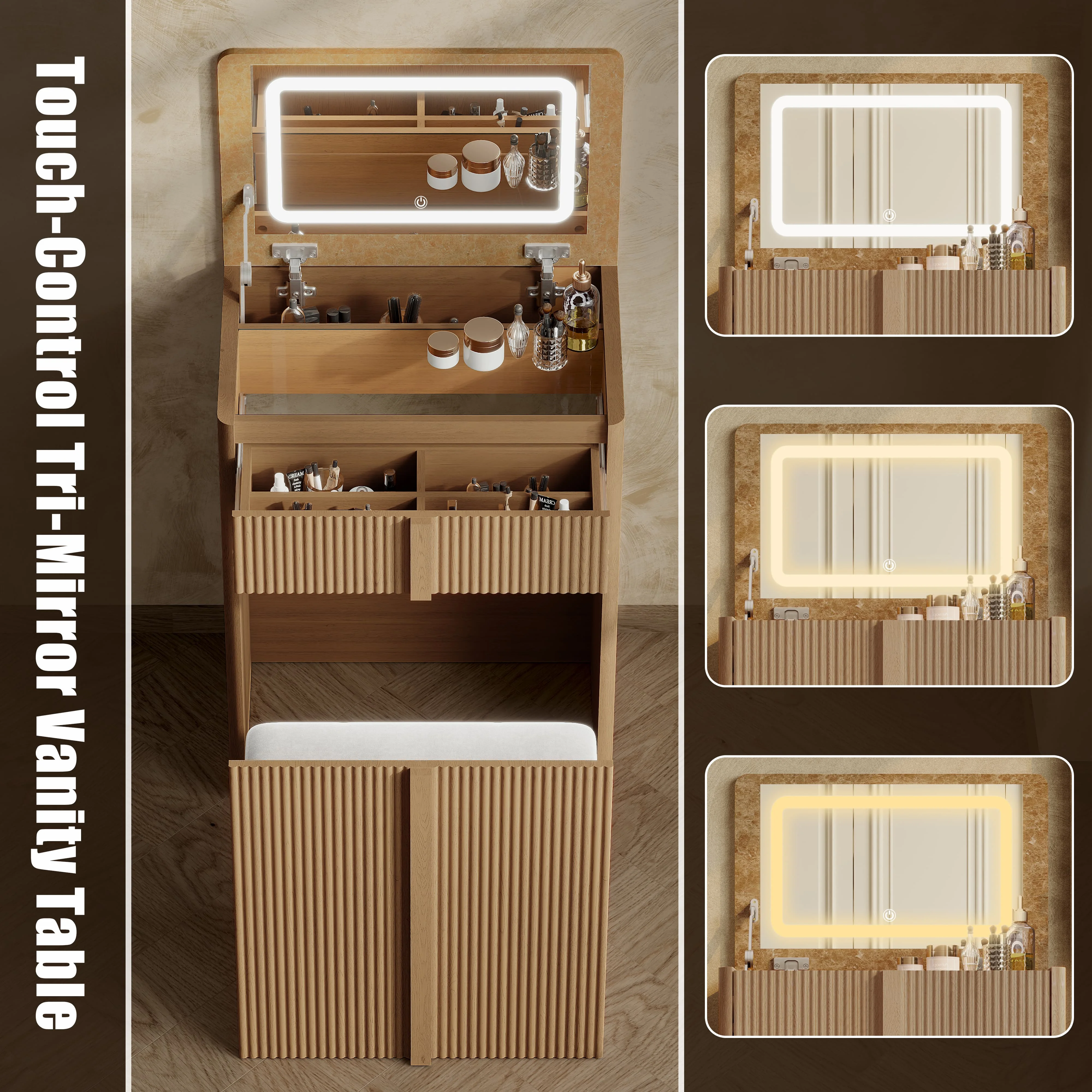 Smart LED Flip-Top Vanity. The tempered glass surface offers clear item visibility. Constructed with scratch-resistant, water-repellent panels and rounded corners, the flip top vanity provides durable performance. The touch-controlled 3-color LED lighting offers adjustable illumination for makeup application, adapting to different lighting needs