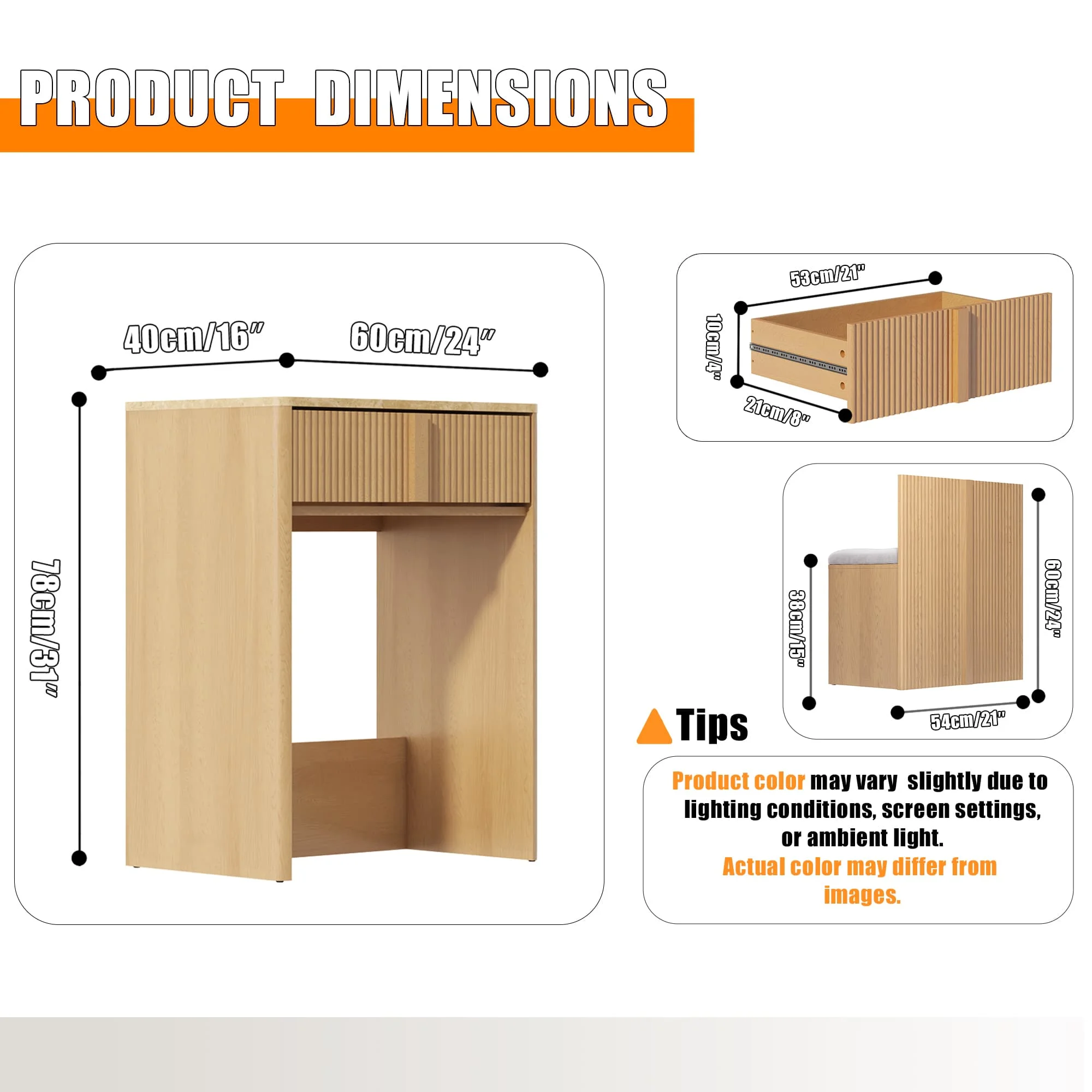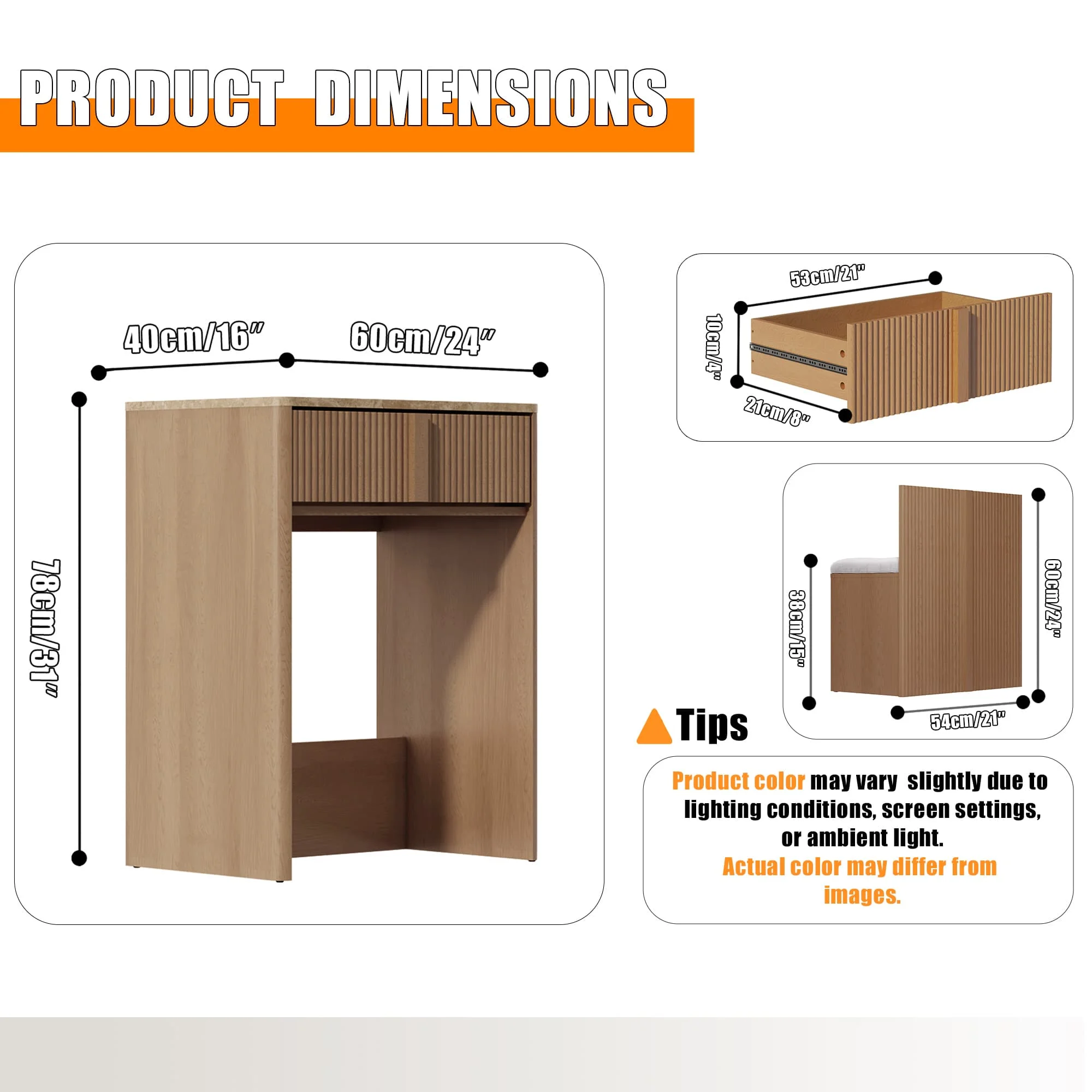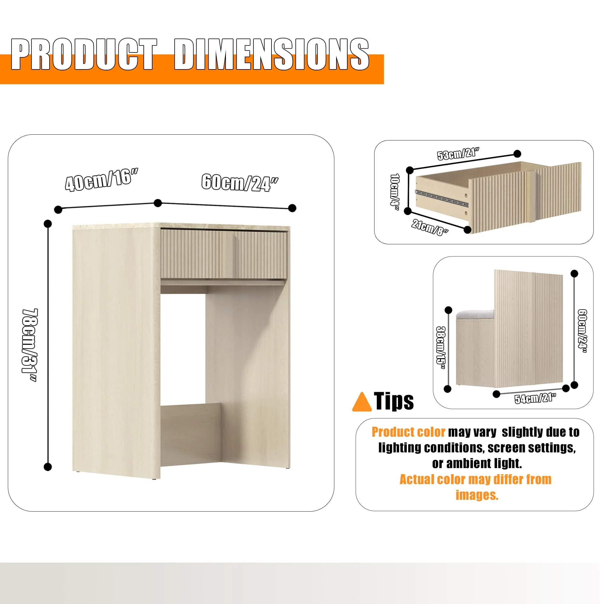 Organized Spacious Storage. The 3-in-1 vanity desk (24"D x 16"W x 31"H) includes a tall-bottle compartment and divided drawer (21"D x 8"W x 4"H) to organize skincare, jewelry, and cosmetics. The oversized upholstered stool with hidden storage and smooth-glide drawers maintain organization while keeping essentials accessible