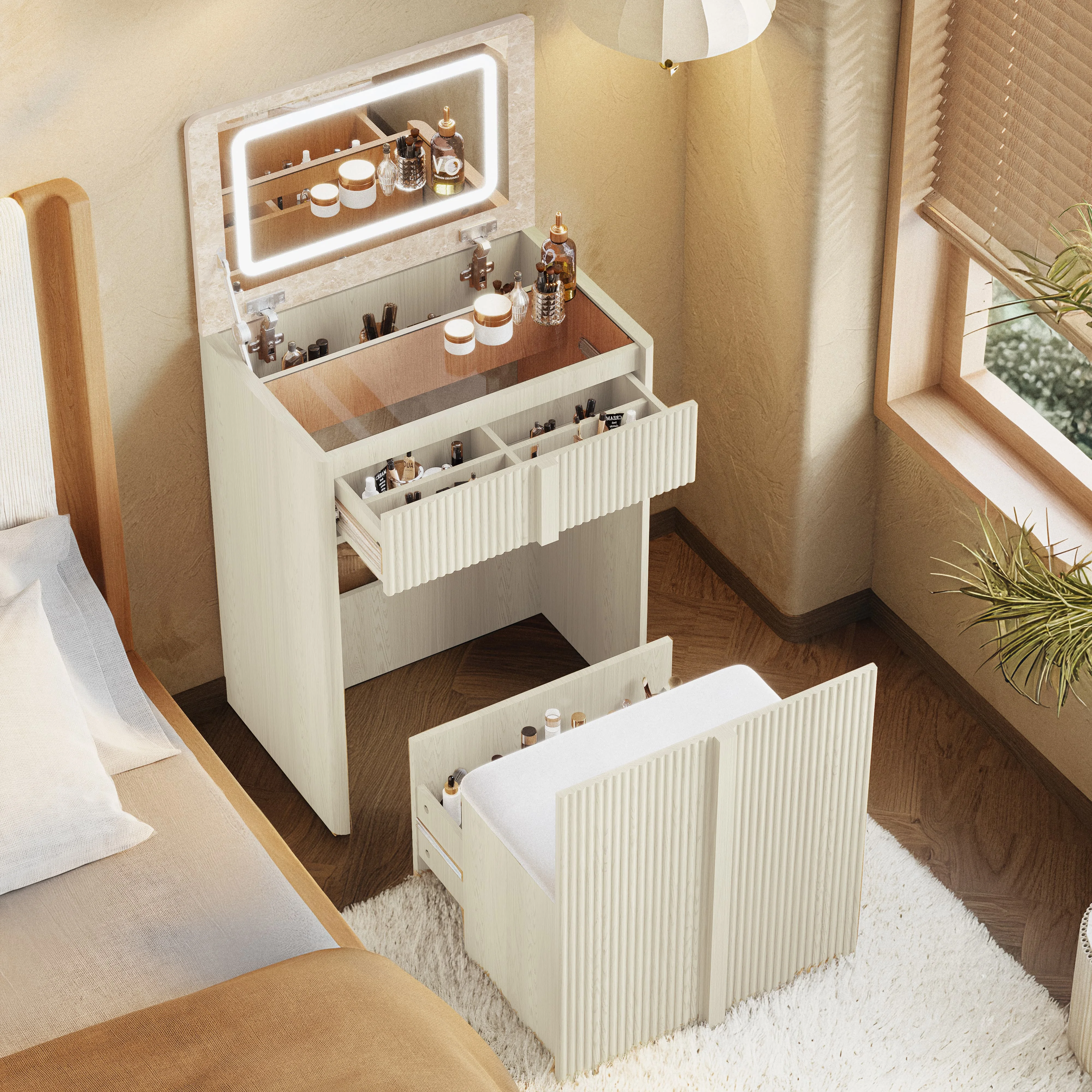 Compact Makeup Vanity. The vanity with space-saving stool features a thick-cushioned seat for comfort. The stool stores completely under the desk (only 0.2㎡ footprint), while widened wooden handles ensure easy movement and design continuity. Designed for convenient makeup access, it streamlines your daily routine