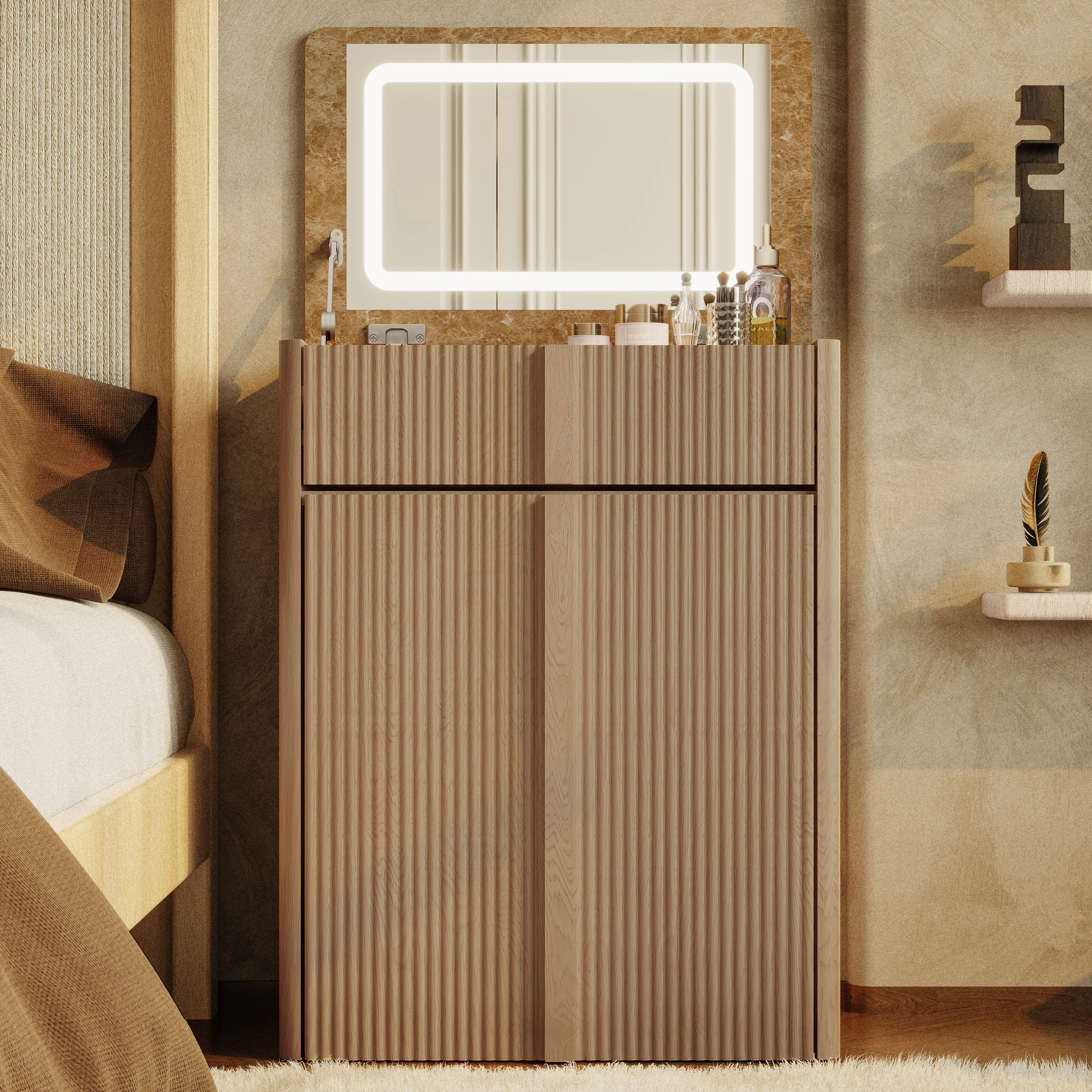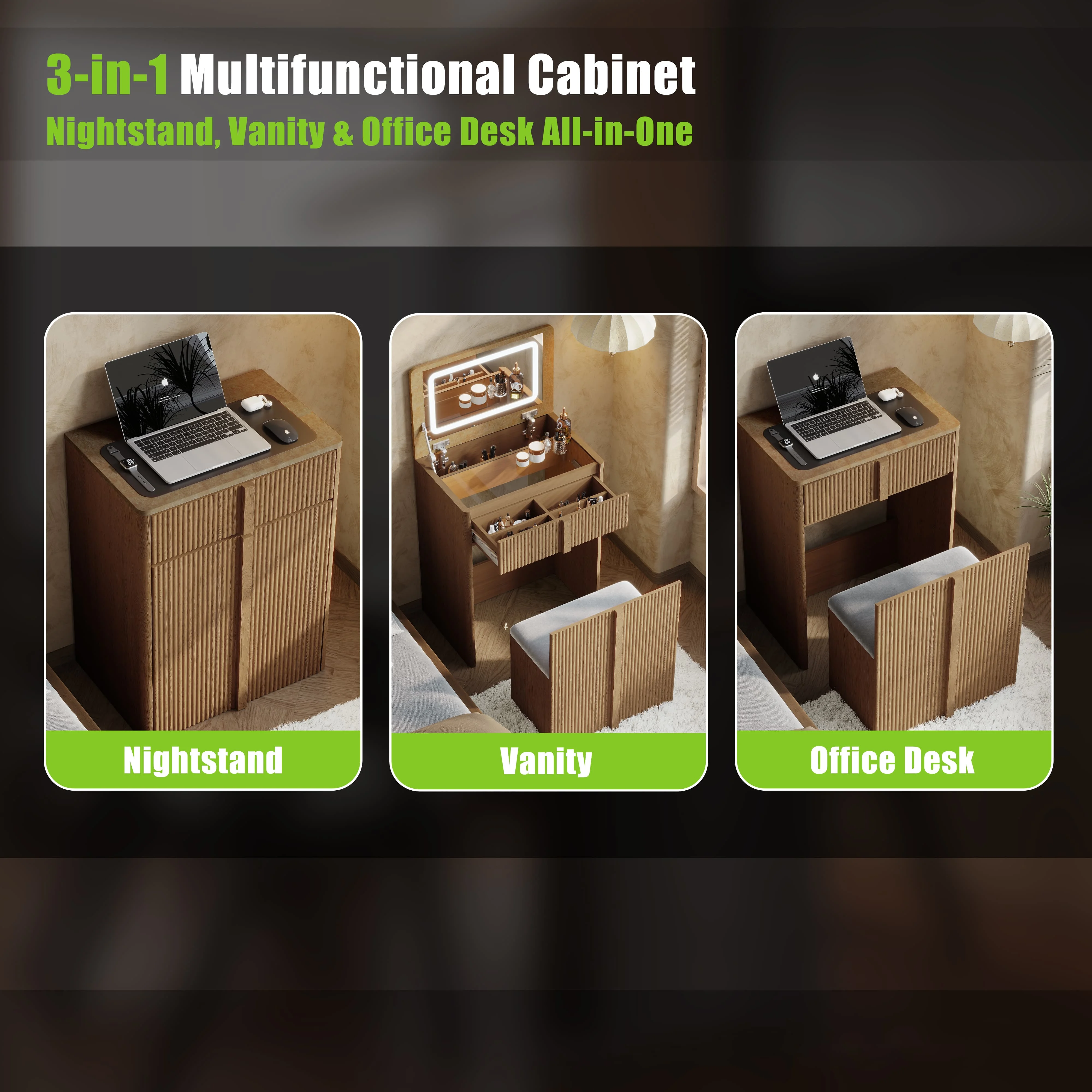 Sleek Curved Vanity with Storage. The arc-shaped 3 in 1 vanity desk enhances bedroom ambiance with its soft contours. Featuring 3D wave-groove detailing and marble-finish surfaces, crafted from engineered wood, it combines minimalist aesthetics with functionality. Rounded corners provide added safety, while its versatile design complements contemporary to mid-century styles