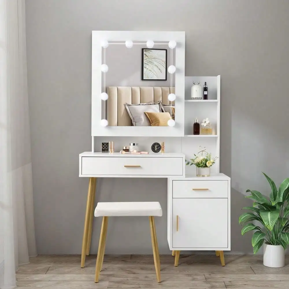 Features: 1.Material: particle board, metal handle 2. Structure: 2 drawers, 1 door, 2 shelves, 1 mirror cabinet 3. Sliding mirror cabinet door, 3-color light adjustment 4. With stool 5. Large storage space 6. Easy to install Specifications: Color: Black 1. Overall Size: 43.3*15.7*63 Inches / ( 110*40*160)Cm (Length*Width*Height) 2. The Size Of The Dressing Table On The Left: (27.6*15.7*29.53) / (70*40*75)Cm / (Length*Width*Height) The Size Of The Cabinet On The Right: (15.7*15.7*23.6) / (40*40*60)Cm / (Length*Width*Height) 3. Dressing Table Drawer Size: (24.4*11.4*2.6) Inches / (62*29*6.5)Cm (L*W*H) Cabinet Drawer Size: (12.2*11.4*2.6) Inches / (31*29*6.5)Cm(Length*Width*Height) 4. Stool Size: (15.75*11.81*17.72 ) / (40*30*45)Cm(Length*Width*Height) Package Includes: 1 x Dresser 1 x Dressing Stool 1 x Accessories Package 1 x Installation Manual