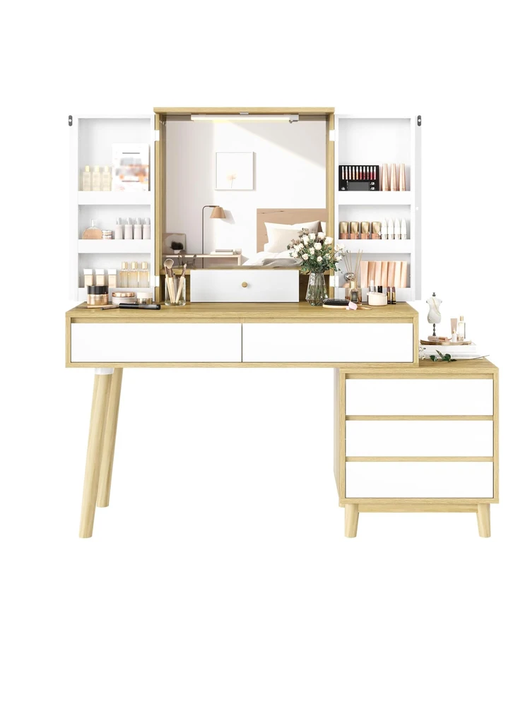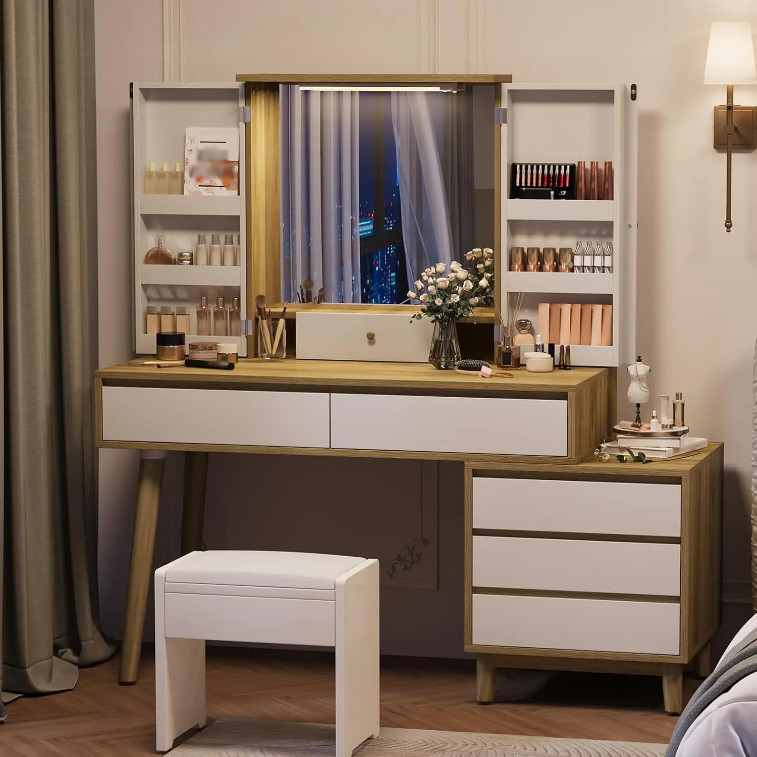 【Adjustable Lighting】--Experience precision and clarity in every step of your makeup routine with our vanity desk's adjustable lighting. Effortlessly customize the mirror's three-color (warm yellow, warm white, and cool white)lighting to suit your preferences.