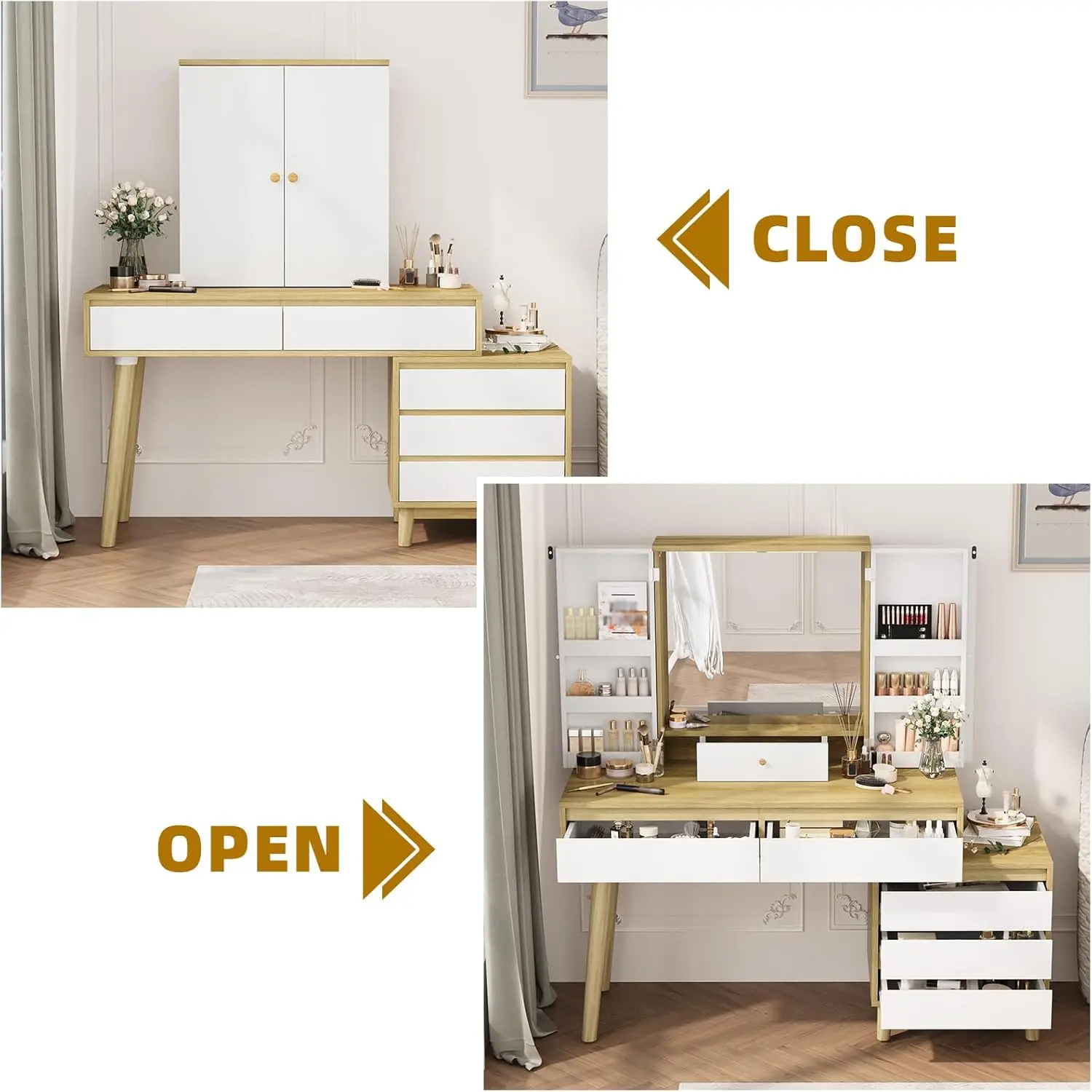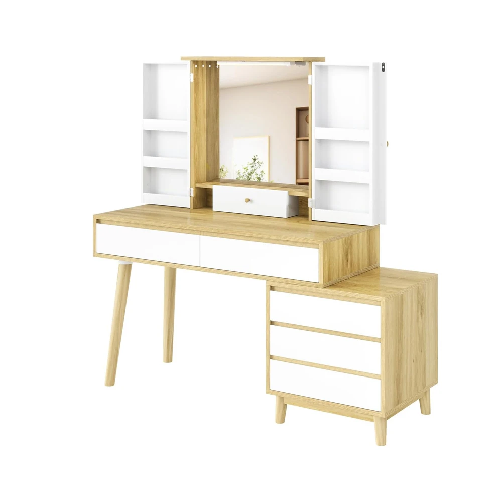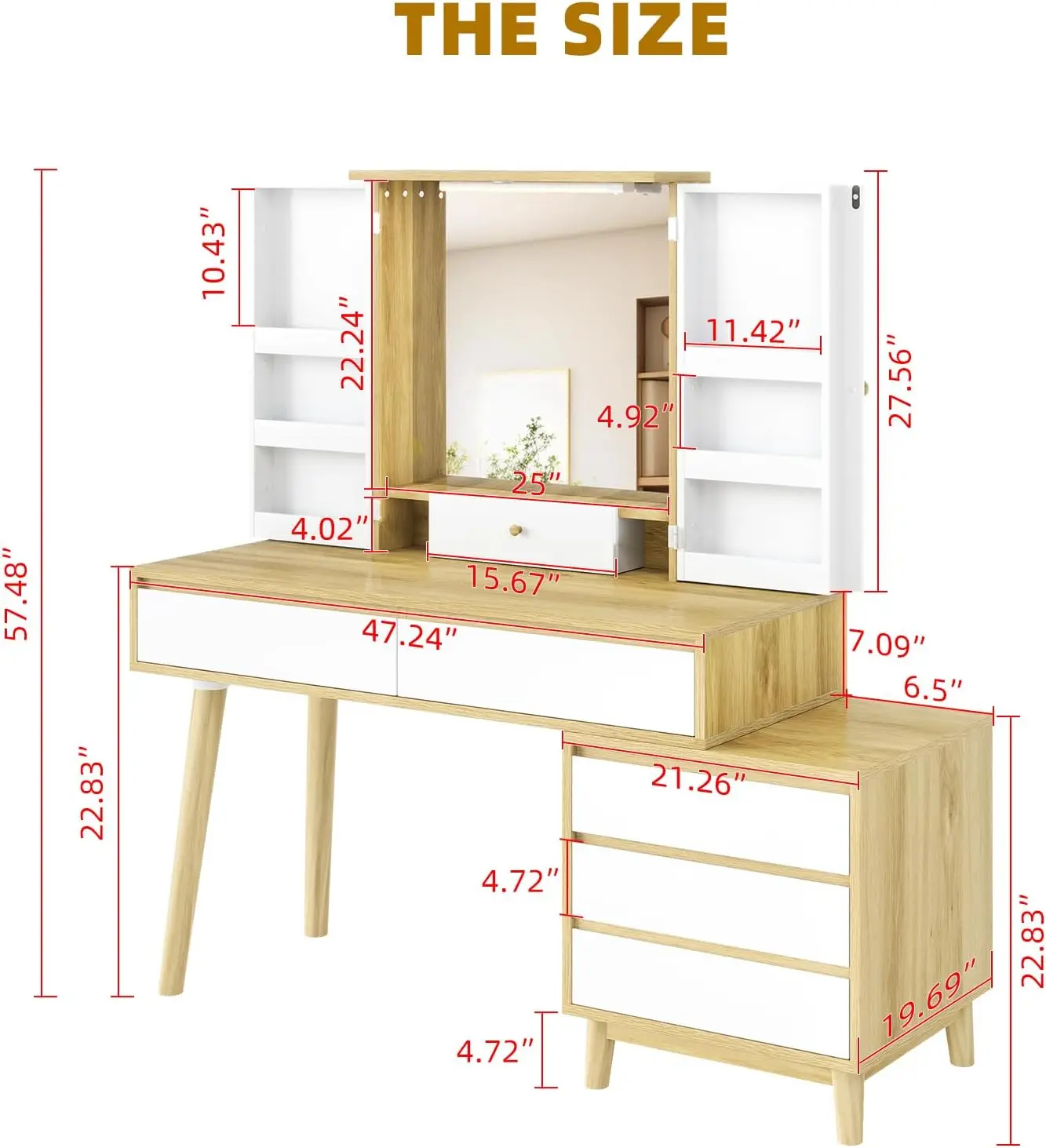 【Stable Construction】--Constructed from high-quality particle board, this vanity desk combines stability with aesthetic appeal. Six sturdy wood legs that provide excellent load-bearing capacity, allowing you to see your wide range of beauty tools at a glance.