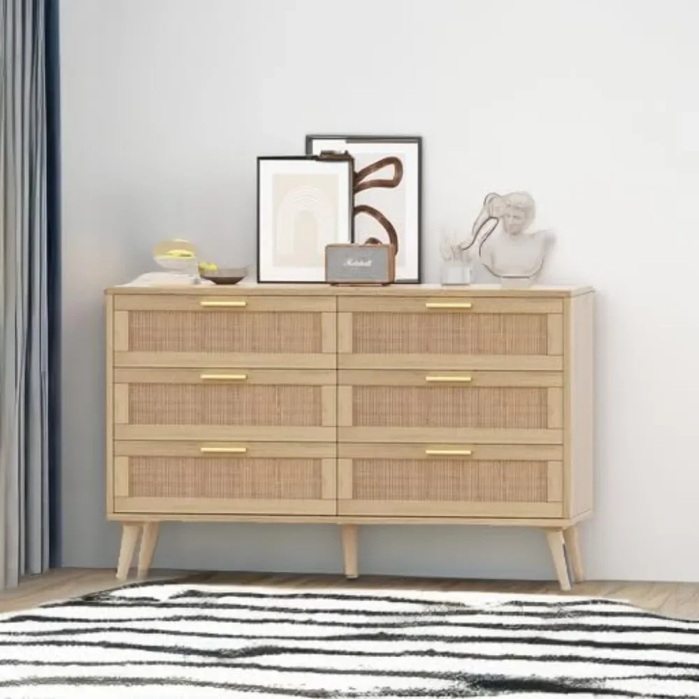 6 Drawer Double Dresser for Bedroom, Rattan Chest of Dressers, Modern Wooden Dresser Chest with Golden Handles