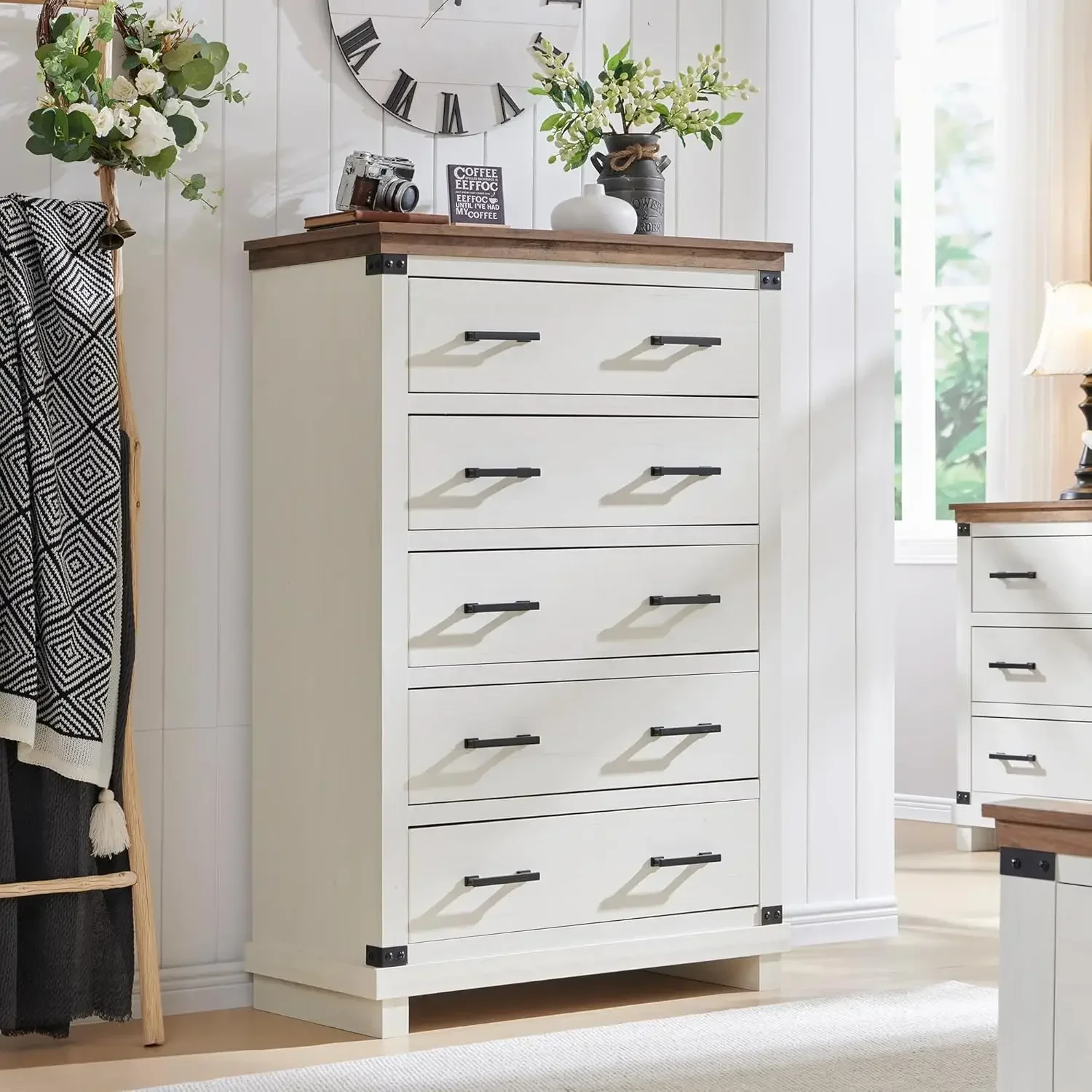 Farmhouse 5 Drawers Dresser for Bedroom, Wood Tall Chest of Drawers with Thick Plank Styling, Rustic Closet Dresser for Bedroom, Living Room, Antique White