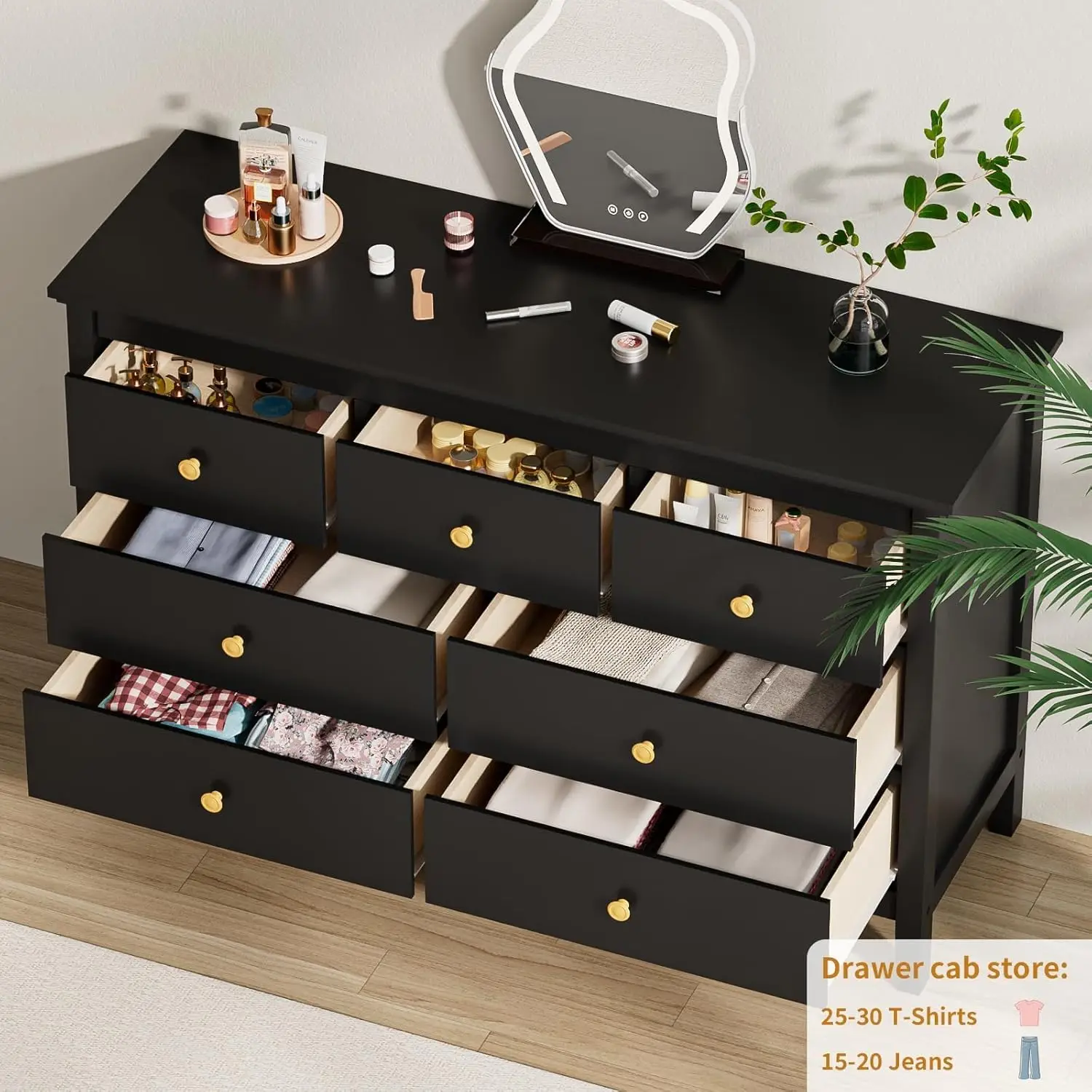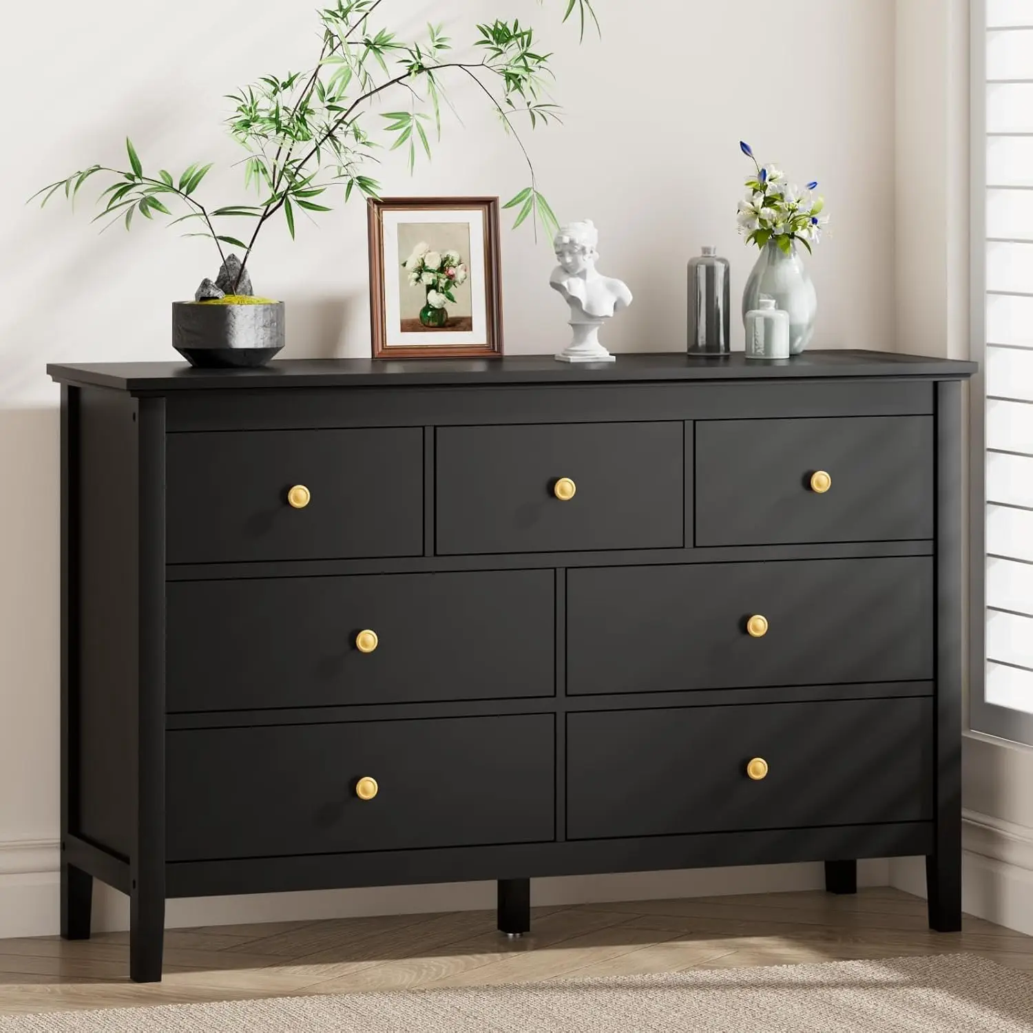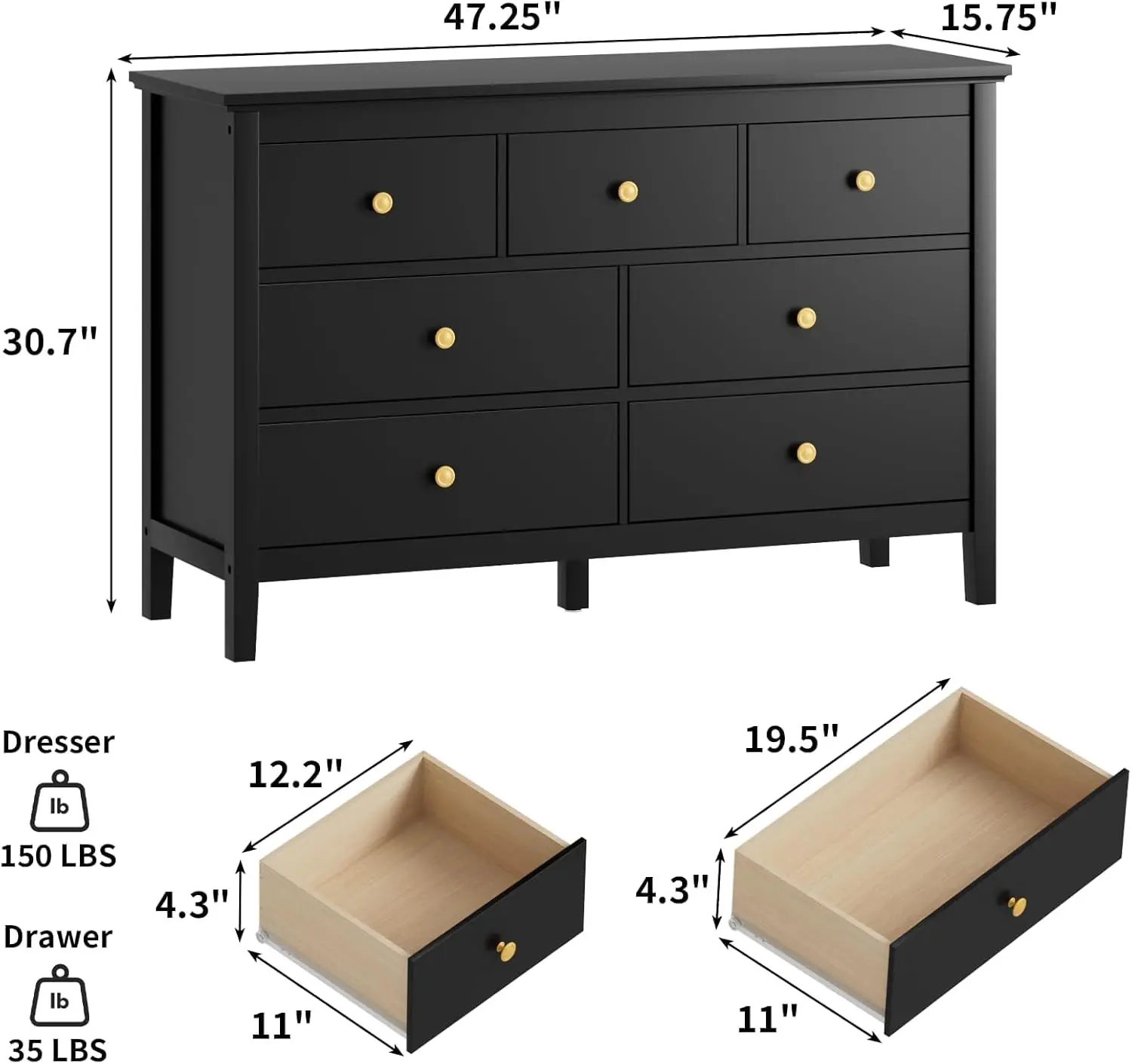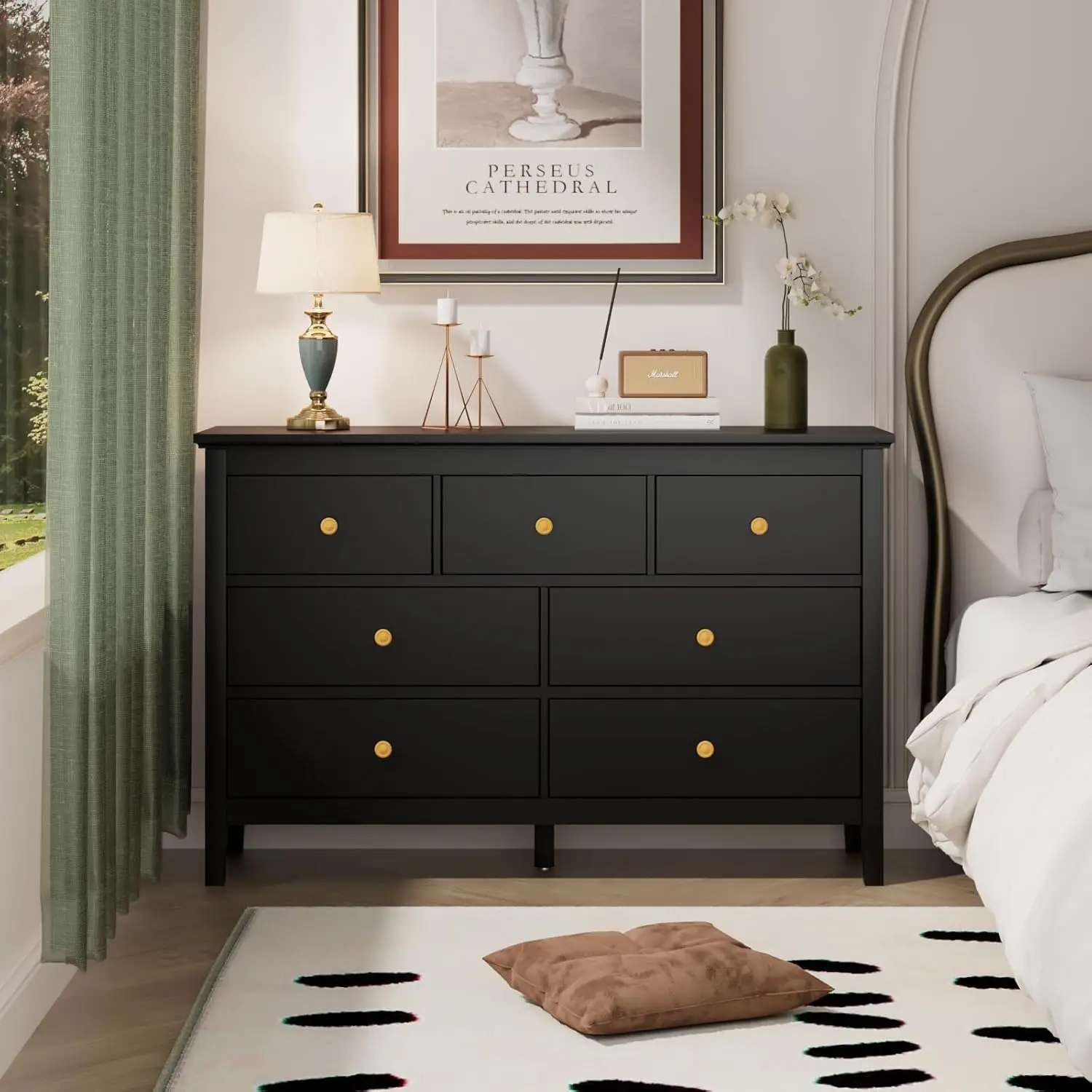 • 7 Deep & Spacious Drawers Tired of clutter? This 7-drawer dresser for bedroom offers ample storage for clothes, makeup, or baby essentials. The wide black and gold dresser provide plenty of room to keep everything organized. Plus, the spacious top is perfect for decor, lamps, or even a 50" TV, making your space both functional and stylish.