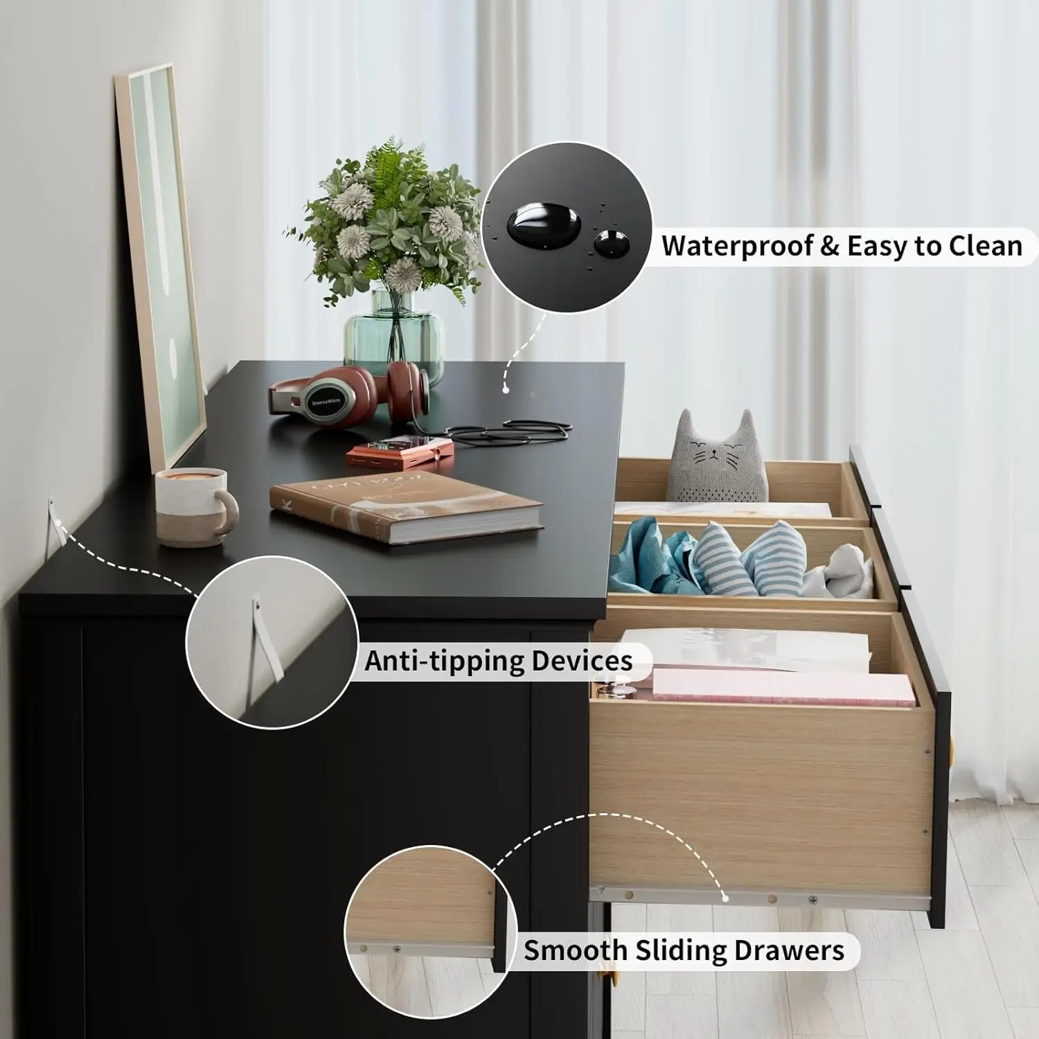 • Sturdy & Durable Build Crafted from high-quality MDF with sturdy metal legs, this black storage dresser is built to last. Each drawer features smooth-gliding rails, ensuring easy access. The waterproof, scratch-resistant finish keeps it looking pristine for years, while the reinforced tapered legs provide extra stability.