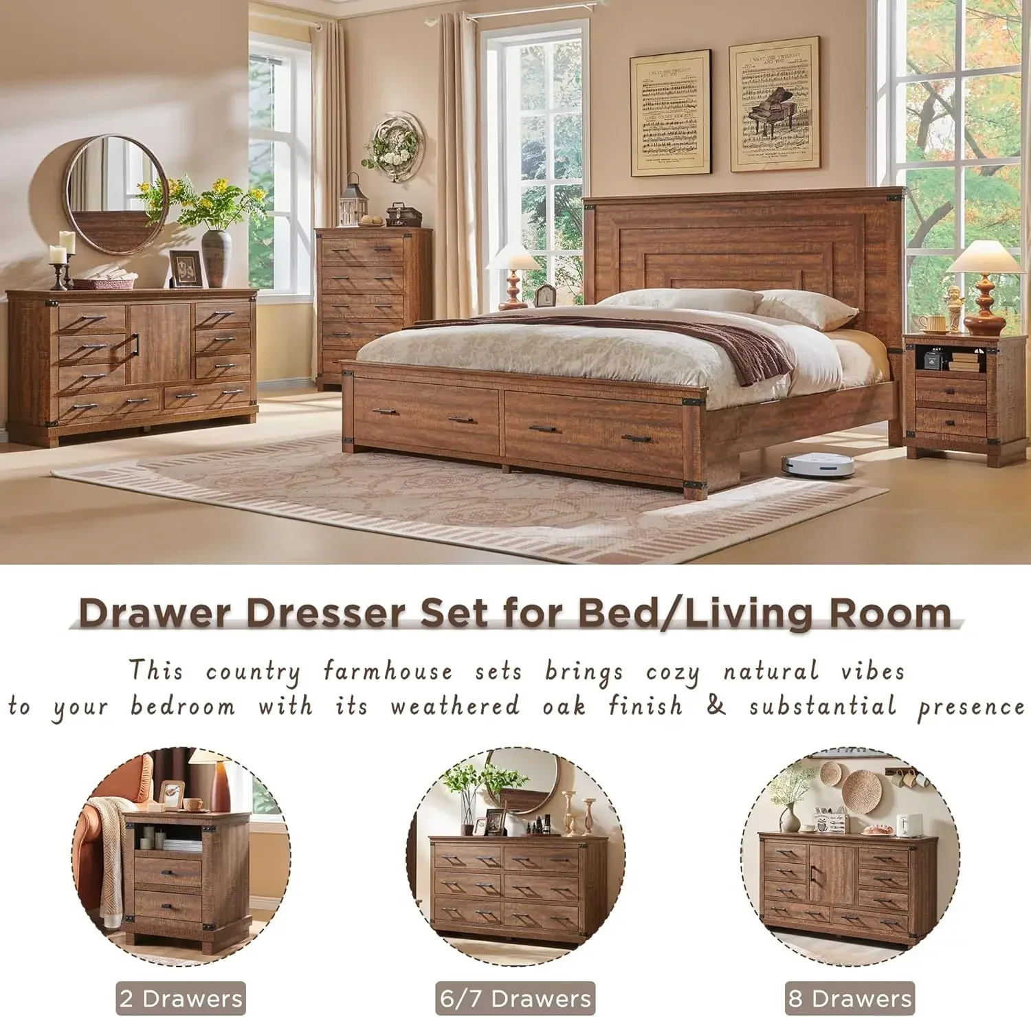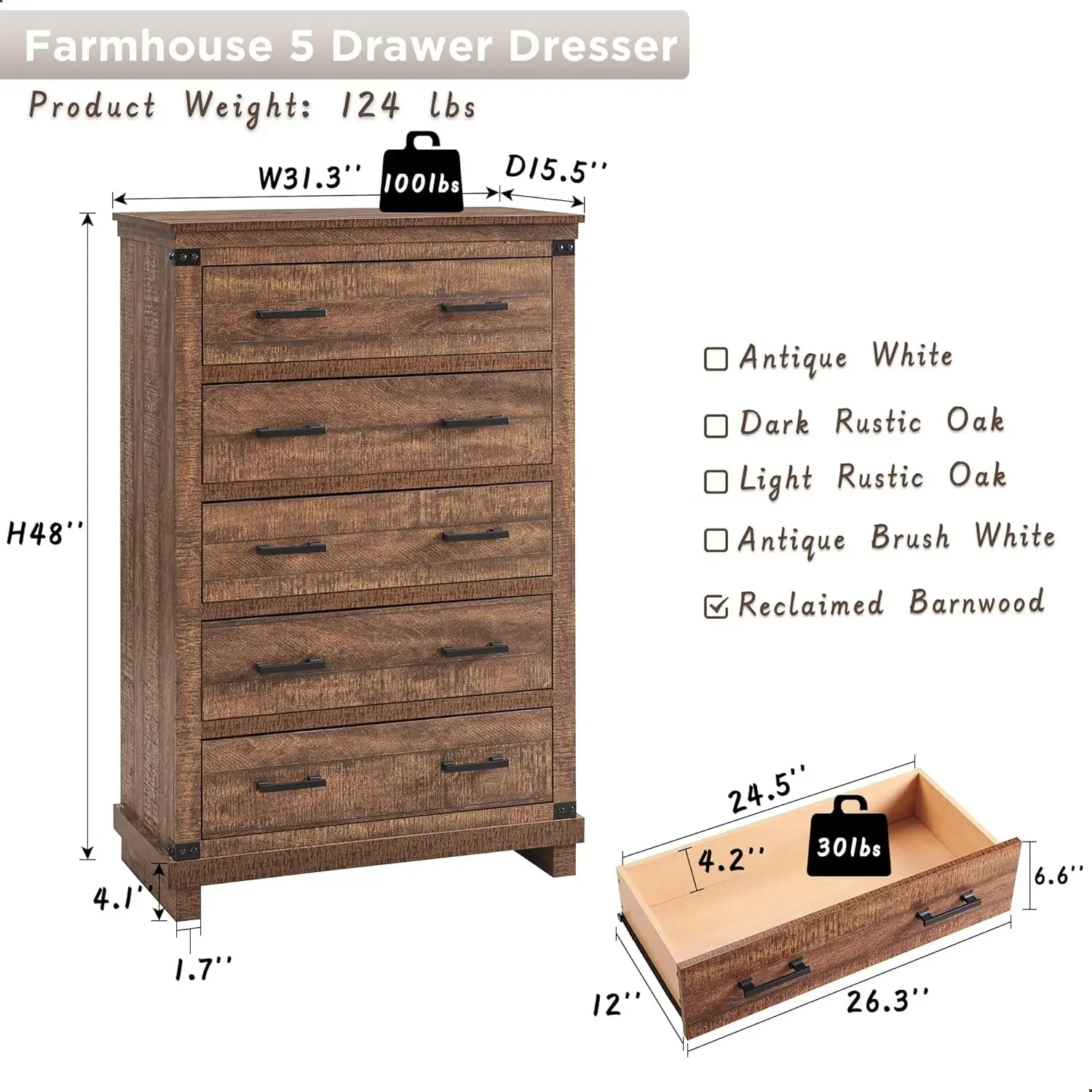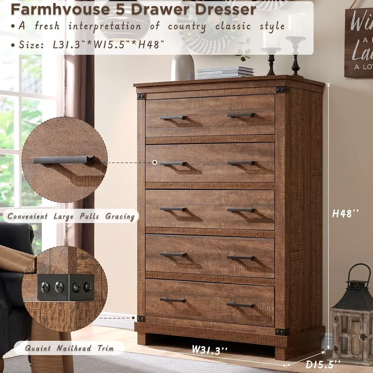 • Richly Rustic Aesthetic: This 5 drawer dresser's crisp, clean and quaint profile is enriched with a striking weathered oak grain with distressed finish and thick plank styling for that much more rustic warmth. Antiqued nailhead trim and handle pay homage to country farmhouse, making for a chic look loaded with charm, eamlessly complementing any furniture and decor style.
