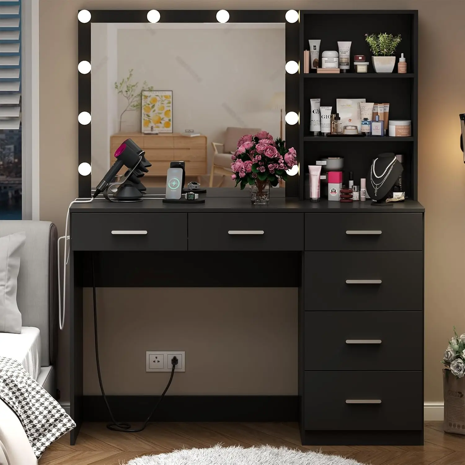 • 💄 【Perfect Storage Solution for Makeup Enthusiasts】Stay organized with six spacious drawers and three-tier side storage shelves, providing ample space to neatly store your makeup, skincare products, and accessories. The wide desktop gives you plenty of room to spread out, while two open shelves keep frequently used items within easy reach, maintaining a tidy and stylish setup.