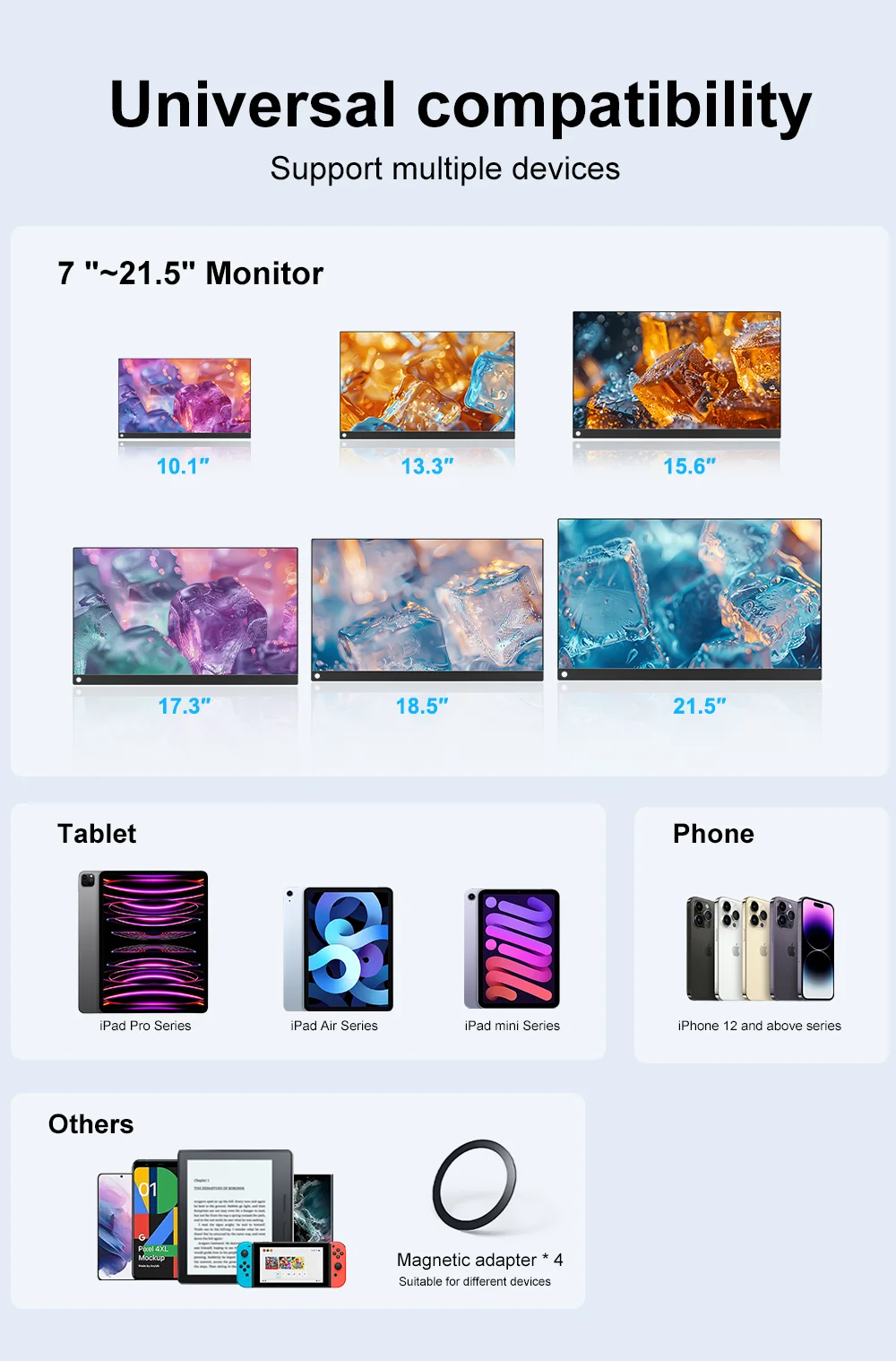 Supports multiple devices, including iPhone series, iPad Pro series, iPad Air series, iPad mini series, and portable display series, providing extensive compatibility to meet the needs of different users.