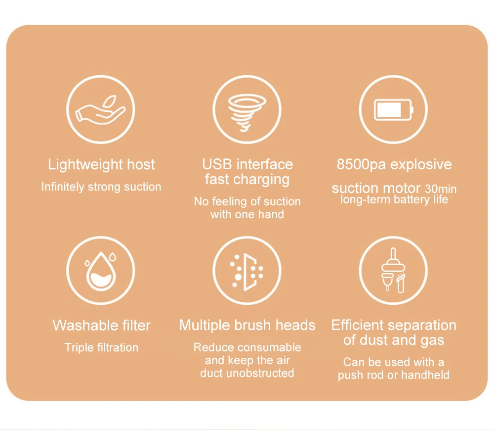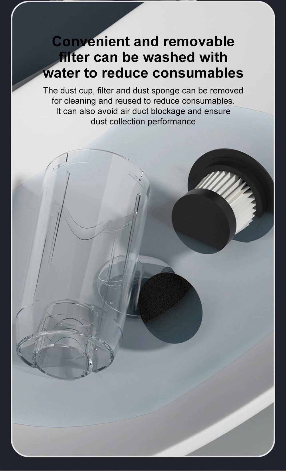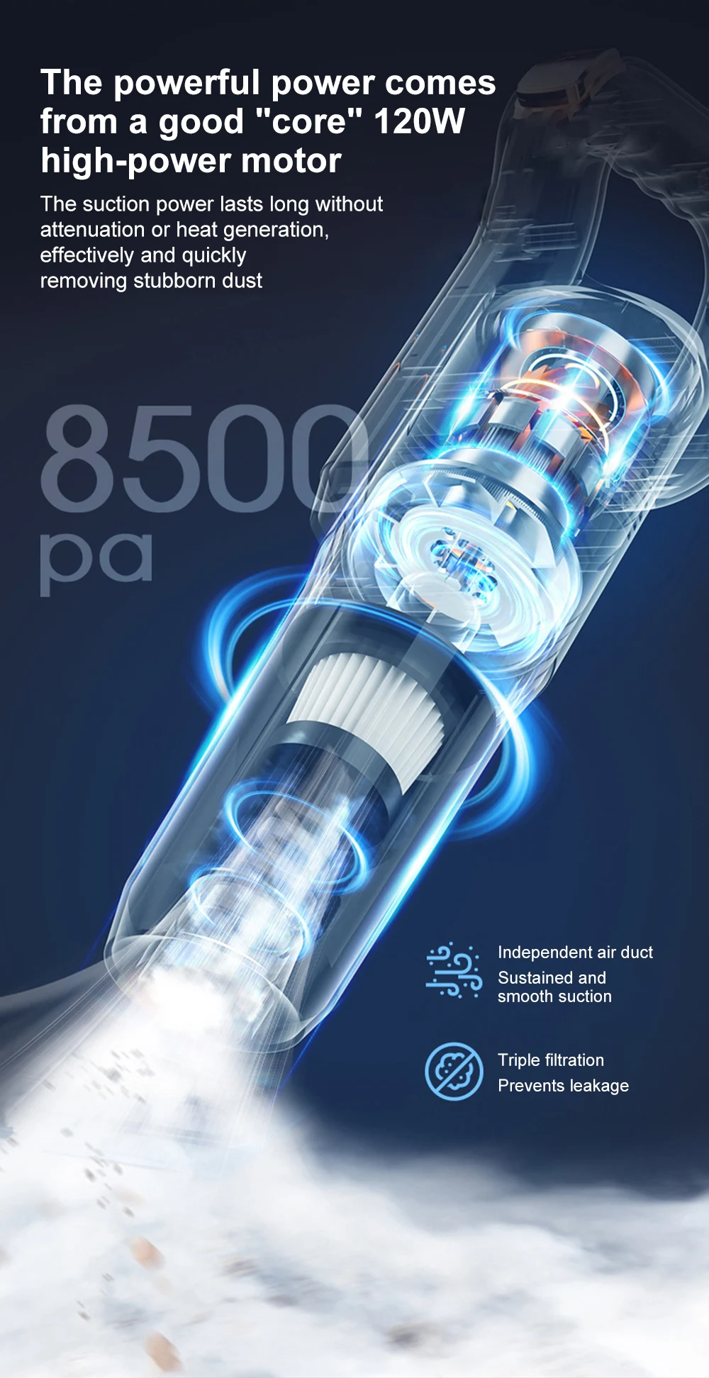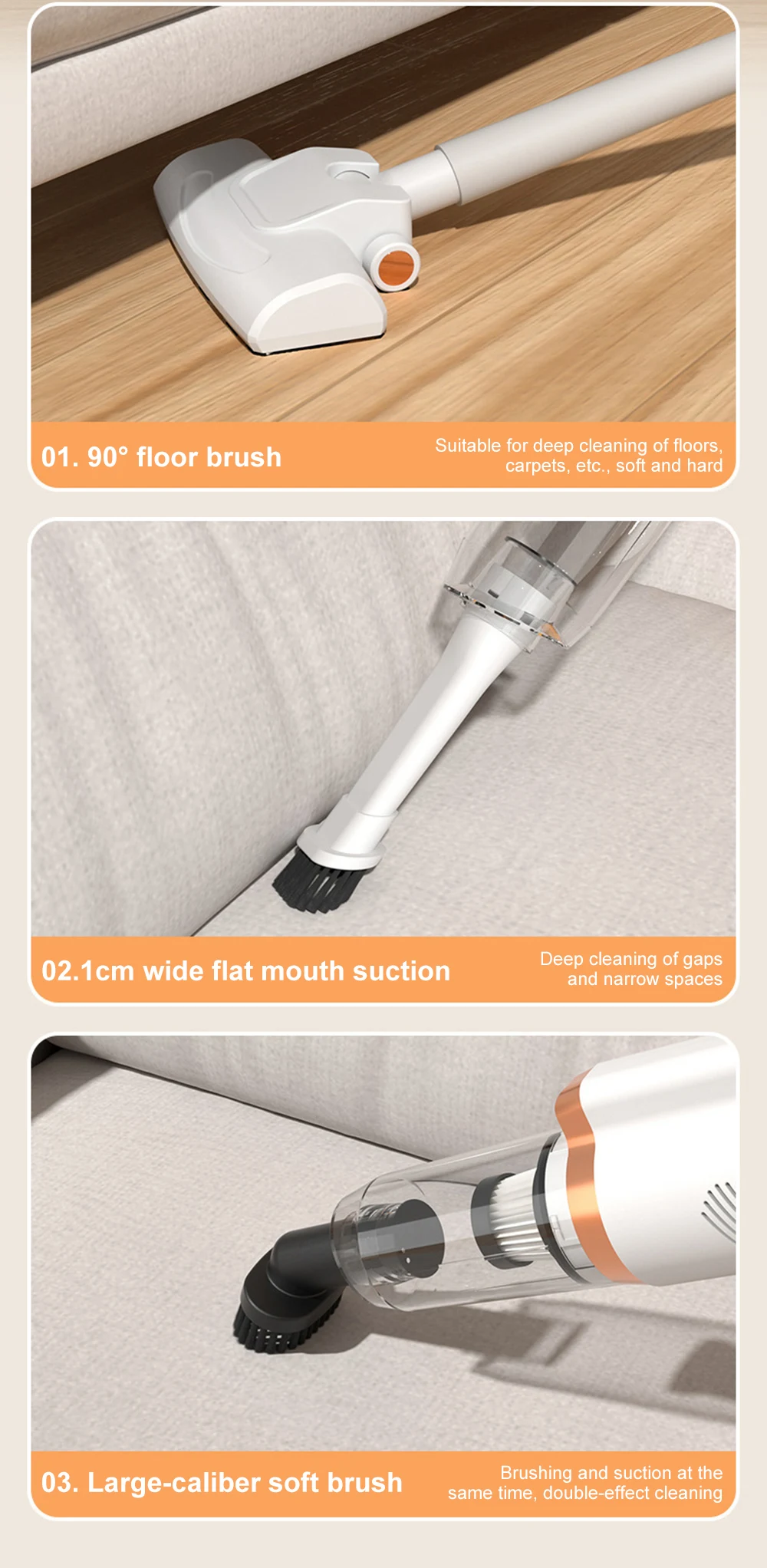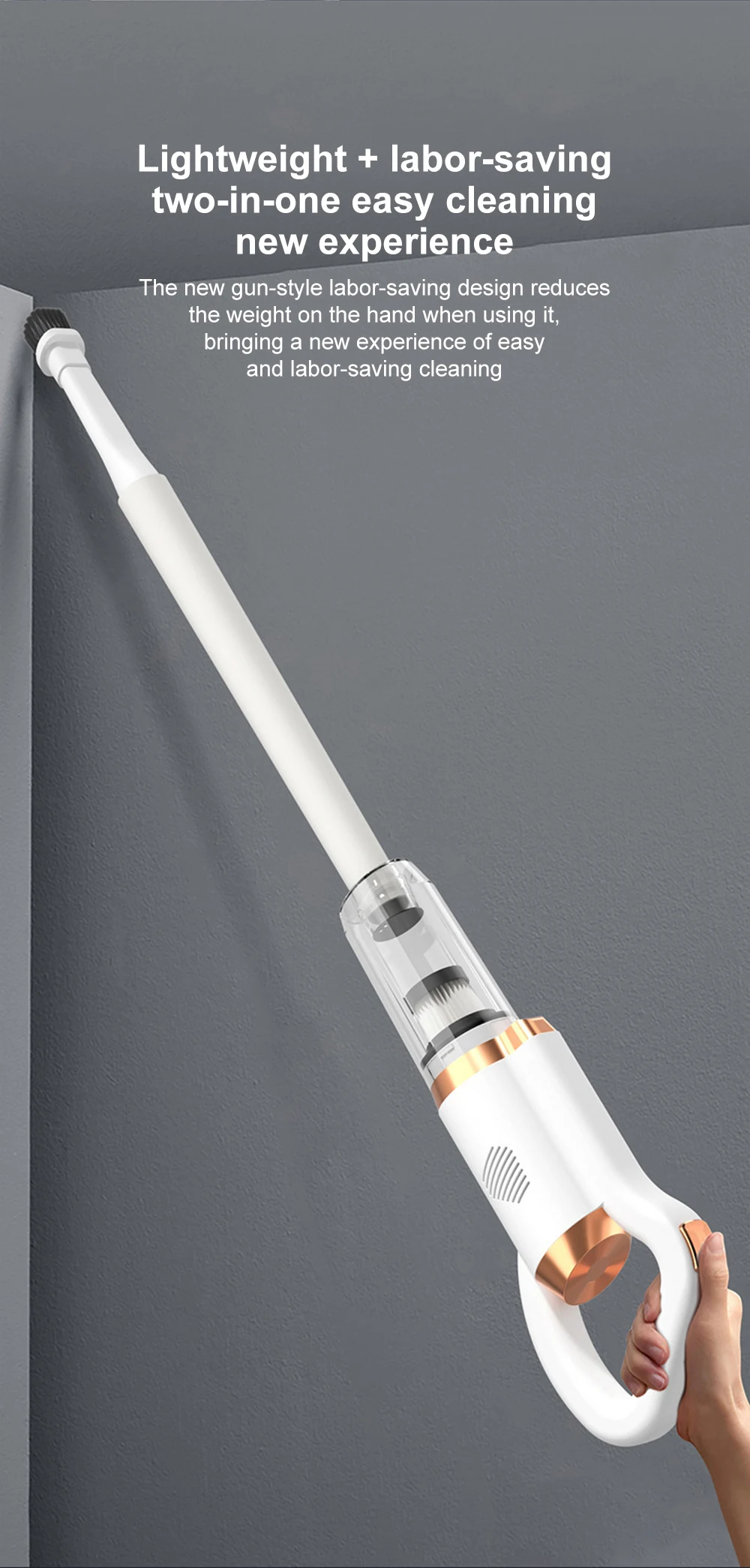 Handheld Water Sweeper USB Rechargeable Strong Suction Cordless Portable Cleaning Robot 2 in 1 Large Suction Vacuum Cleaner 120WFeature: 1. Powerful Suction: Our handheld wireless vacuum cleaner boasts a 8500pa suction power, capable of picking up the tiniest dust and dirt particles, ensuring a thorough clean on both carpets and hard floors quickly and efficiently. 2. Large Dust Cup Capacity: Equipped with a 500ml dust cup, the vacuum electric sweeper allows for extended cleaning sessions without the need for frequent emptying, making your cleaning process faster and more efficient. 3. Long Battery Life: The cordless portable cleaning robot is powered by a 2000mAh lithium battery, offering up to 15 minutes of use after a 3-hour charge, with the convenience of quick recharging via the included USB cable. 4. Versatile Cleaning Tools: To facilitate easier cleaning, our large suction vacuum cleaner comes with a floor brush and two extension tubes. The floor brush is ideal for hard floors, while the extension tubes allow access to tight spaces and corners. 5. Compact and Portable: Designed to be compact and lightweight, the vertical clean electric vacuum cleaner is easy to carry and use anywhere you need, making it the perfect cleaning tool for homes, cars, or offices.