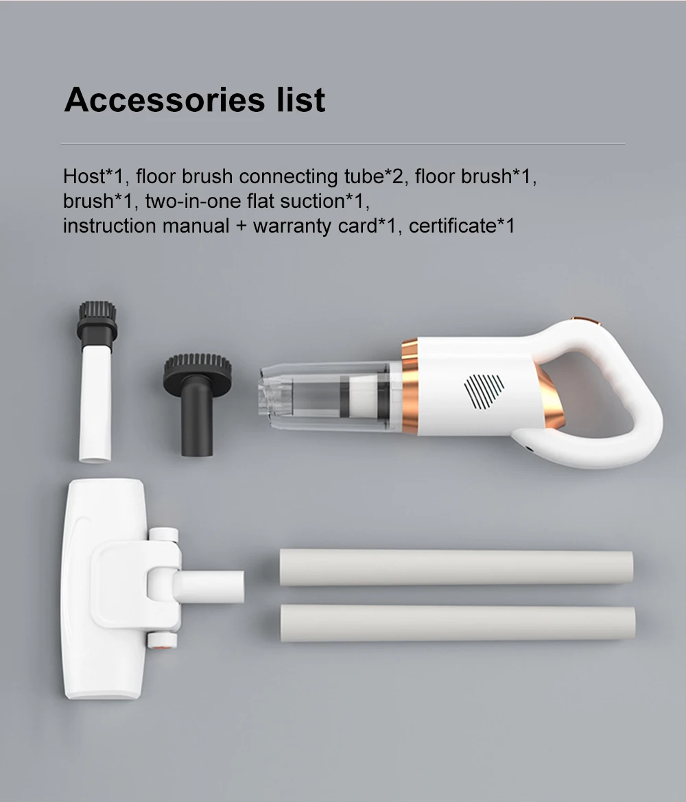 1 x Vacuum Cleaner 1 x Floor Brush 1 x Pipe Brush 1 x 2 In 1 Flat Straw Brush 2pcs x Connecting Tube 1 x USB Charging Cable |