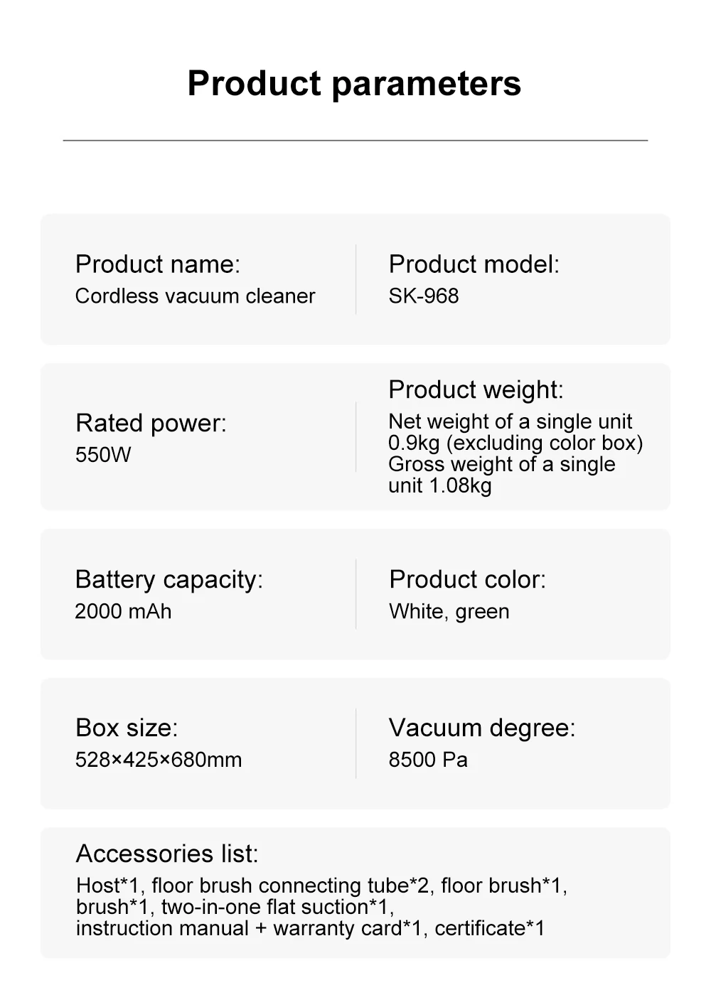 Specification: Origin: Mainland China Function: Mopping & Sweeping & Suction Type Material: plastic Color: picture color Product size: 1055mm*242mm*88mm/41.5in*9.5in*3.5in Net weight: 900g Gross weight: 947g Rated power: 120W Suction power: 8500pa Dust collection cup: 700ml Working voltage: 7.4V Charging voltage: 8.4V Charging current: 0.5A-1A Battery capacity: 2000mAh Charging time: about 3.5 hours Working time: about 15 minutes Note: Due to the different monitor and light effect, the actual color of the item might be slightly different from the color showed on the pictures. Thank you! Please allow 1-2cm measuring deviation due to manual measurement.
