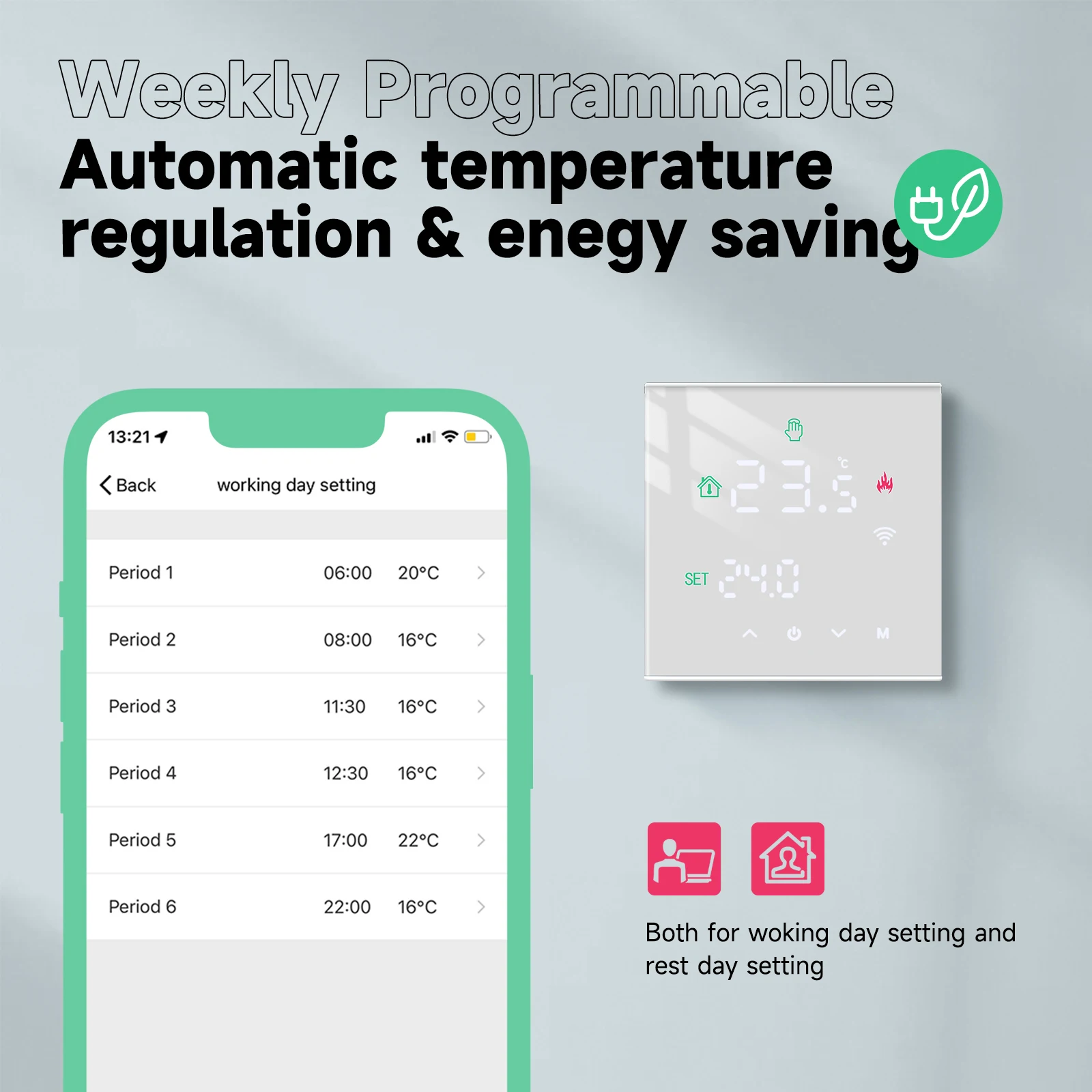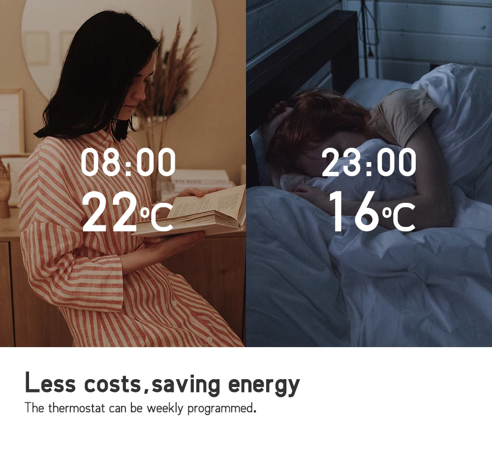 With 5 + 2/6 + 1/7 daily programming, you can set different temperatures for 1-6 periods per work days and 2 periods on weekend to match your daily life. Makes your life more easier~