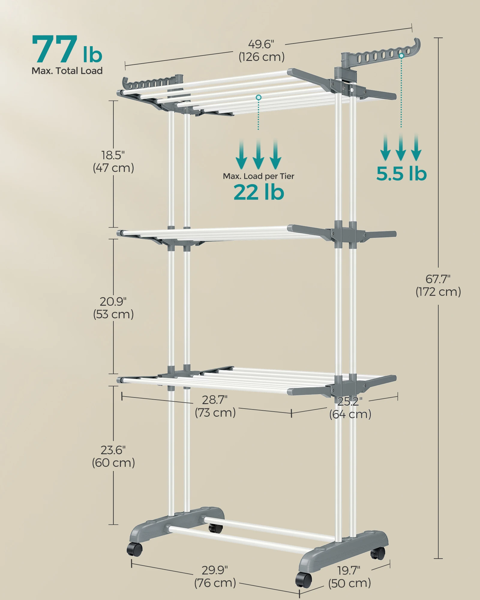 [Sturdy and Durable] This drying rack is made from heavy-duty stainless steel and thick plastic, with reinforced double rods on both sides. It's sturdier than your average drying rack and boasts a longer lifespan, capable of supporting up to 77 lb