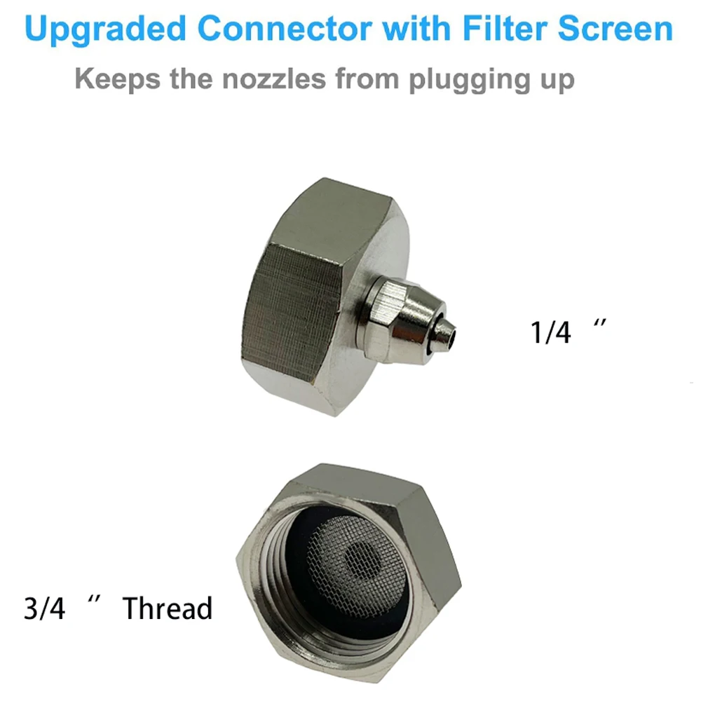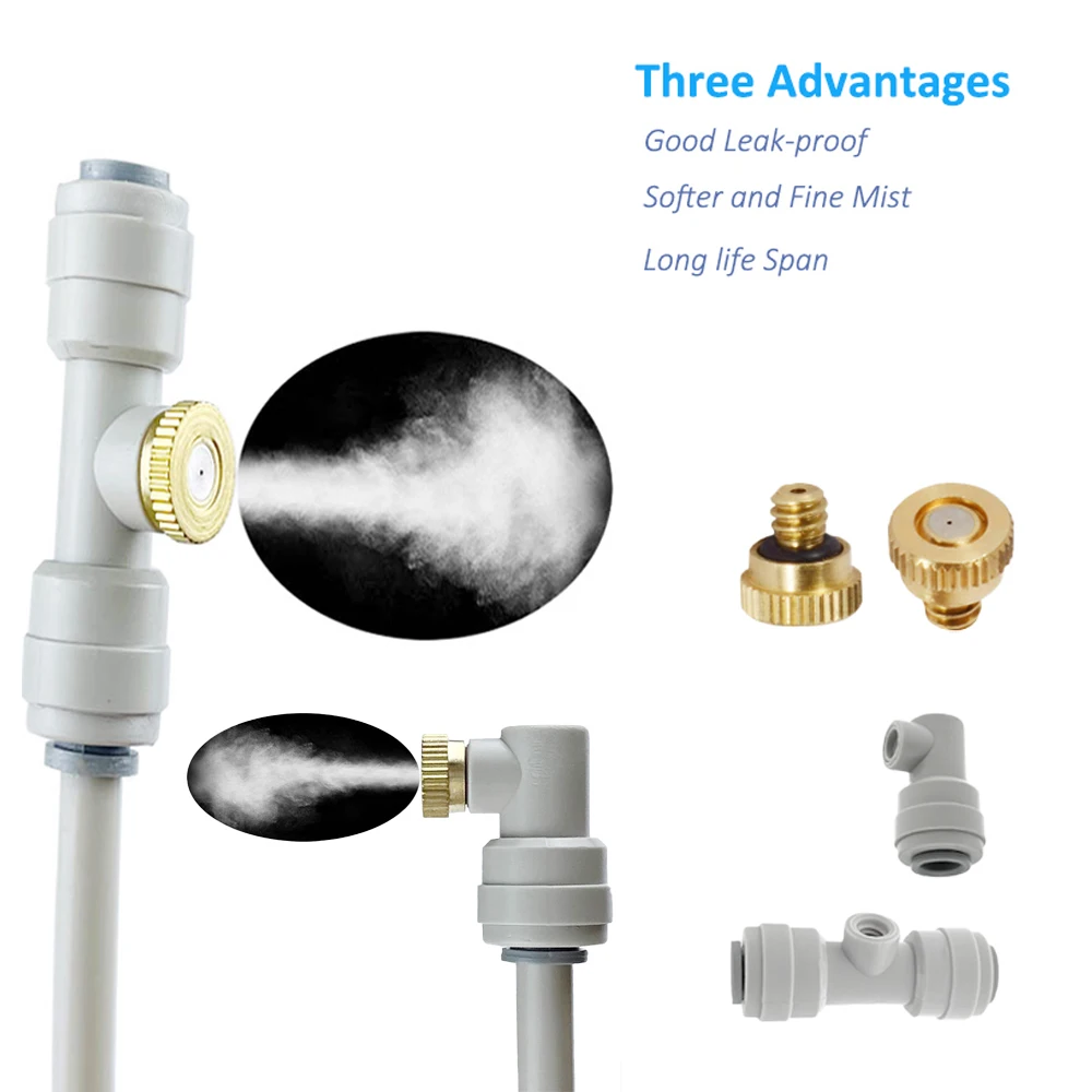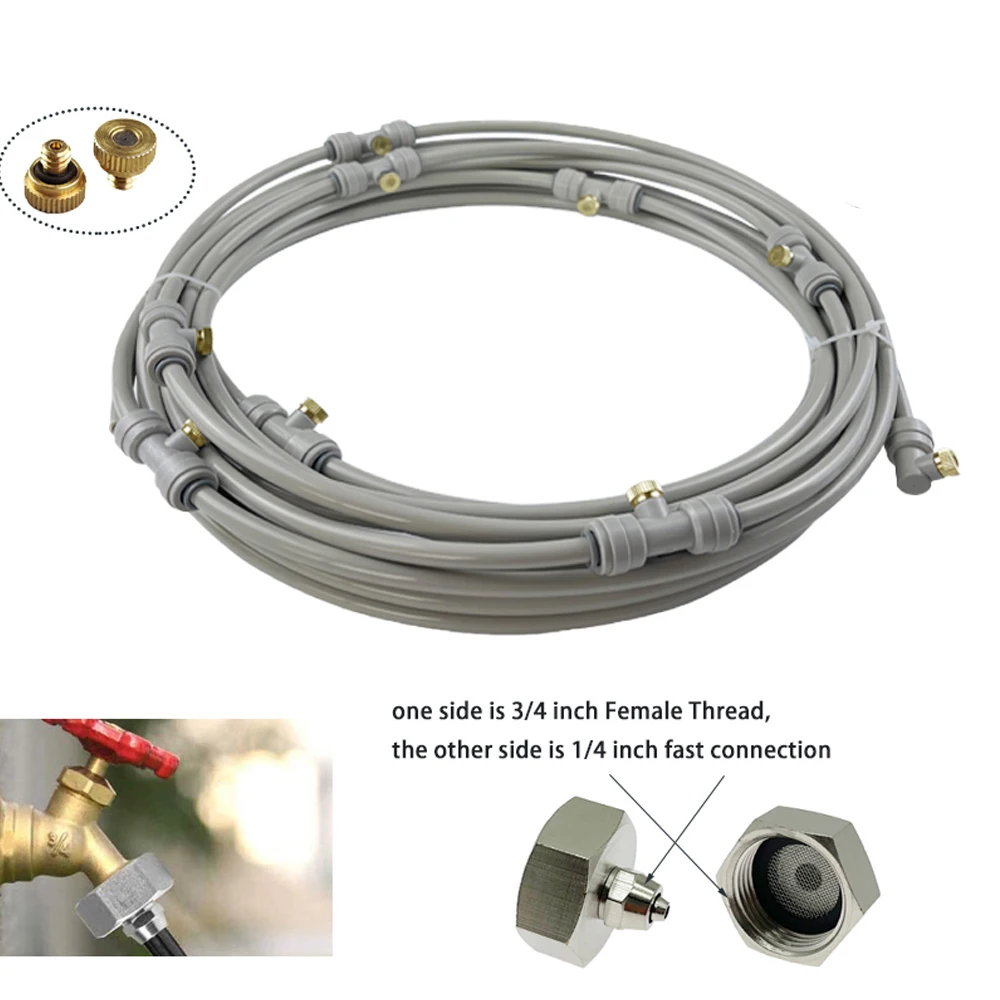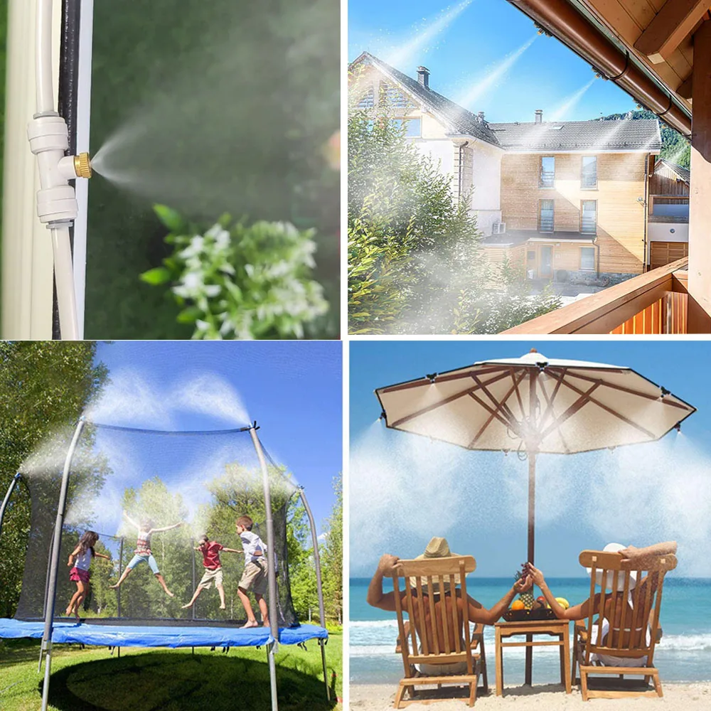 Good Quality & Updated Design: The outdoor mist cooling system equips with a universal brass adapter(3/4") , flexible durable PE misting line, upgraded brass nozzles which are no leaking and have more smooth spray, good sealing tubing connector. All the accessories have a good quality, good sealing, no water leakage, no dripping, longer service life.