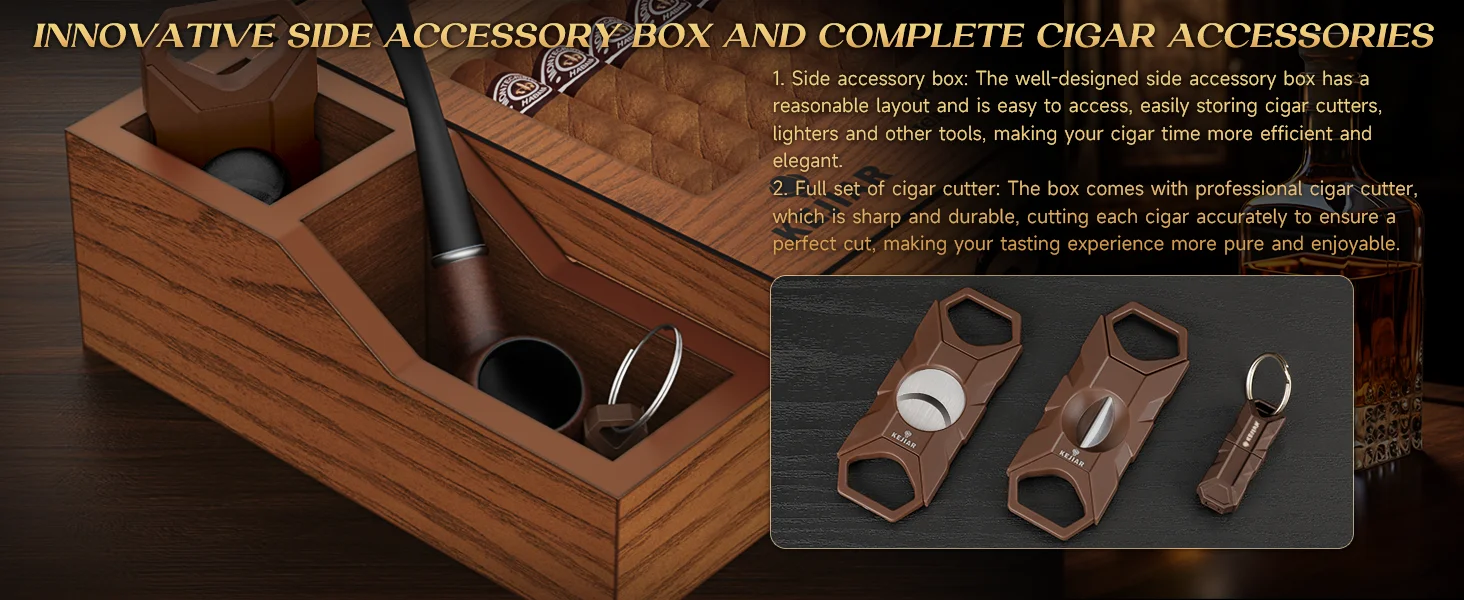 【Innovative Side Cigar Accessory Case 】Stay organized with the side-mounted cigar accessories case, designed to store your high-quality cigar torch lighter, v-cutter cigar, cigar punch cutter, cigar cutter and more. This cigar humidor box isn’t just about storage—it’s about preparation with elegance. The dedicated compartments keep your cigar cutter set and cigar lighter secure, so you’re always ready for a smooth, precise cut and a perfect light. Ideal for travel or office use, this compact yet spacious design holds 25-30 cigars while keeping cigar humidor accessories neatly tucked away