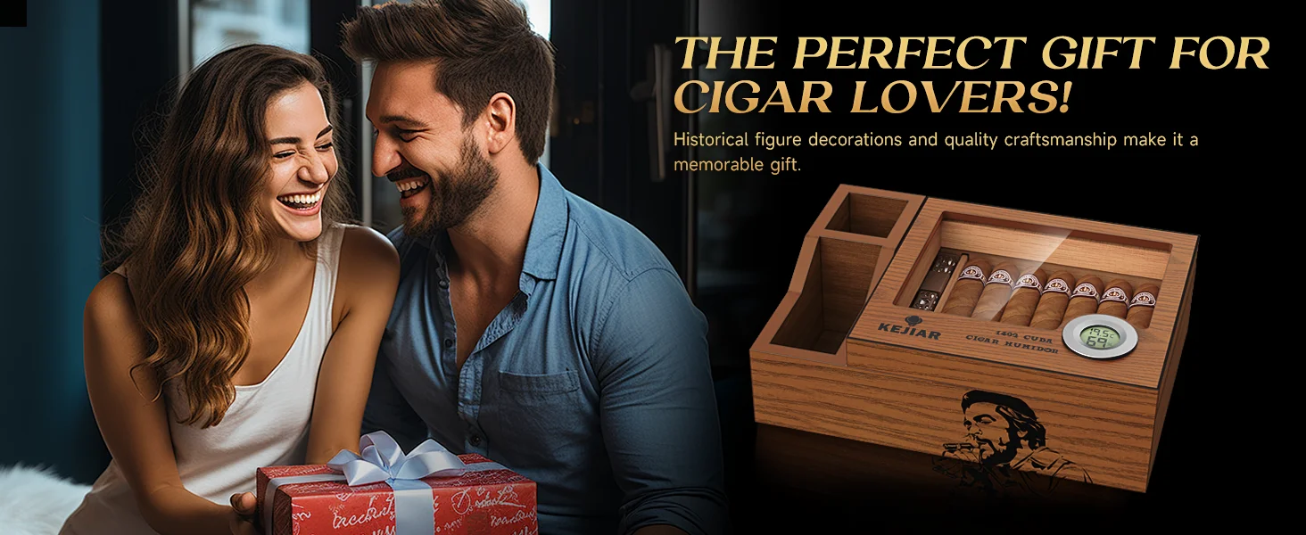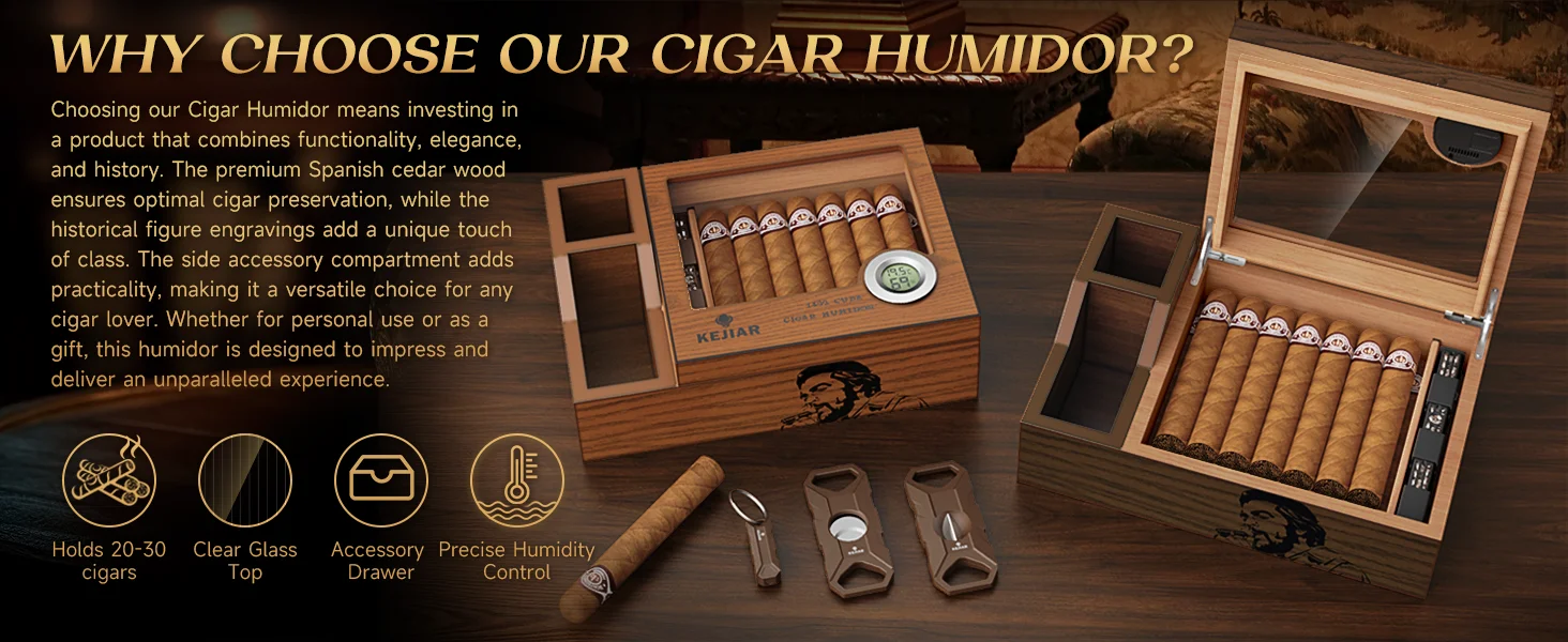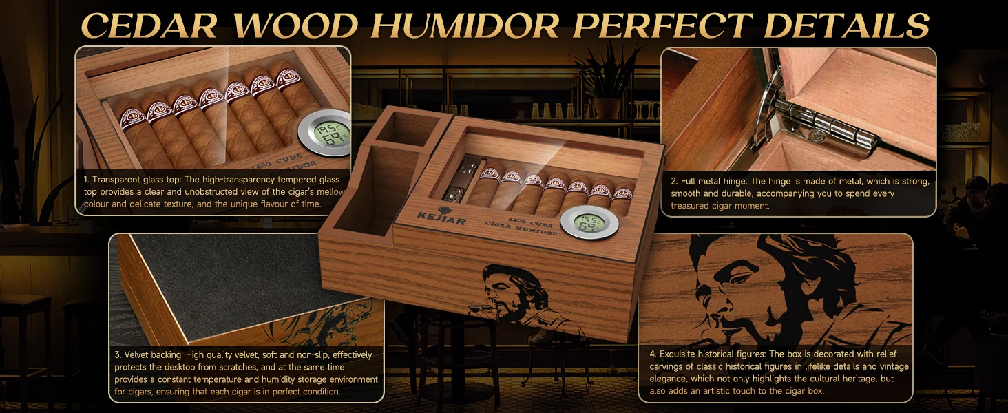 【Innovative Cigar Humidors 】Elevate your cigar experience with our luxury cigar humidor box, featuring a tempered glass-top display that showcases your prized cigars to smoke like a curated collection. Adorned with masculine engravings, this humidor isn’t just storage—it’s a sophisticated desktop centerpiece(desktop cigar humidors dox) and the ultimate cigar gift for men. The innovative side compartment stores cigar accessories for men, including a V-cut cigar cutter, cigar punch tool, and cigar lighter, ensuring every tool is within reach. With a digital hygrometer and sliding crystal gel cigar humidifier, you’re in total control, locking in the ideal 68-72% humidity to preserve freshness