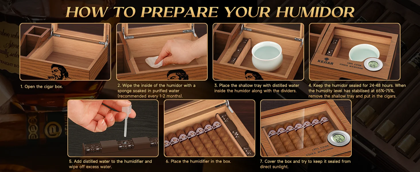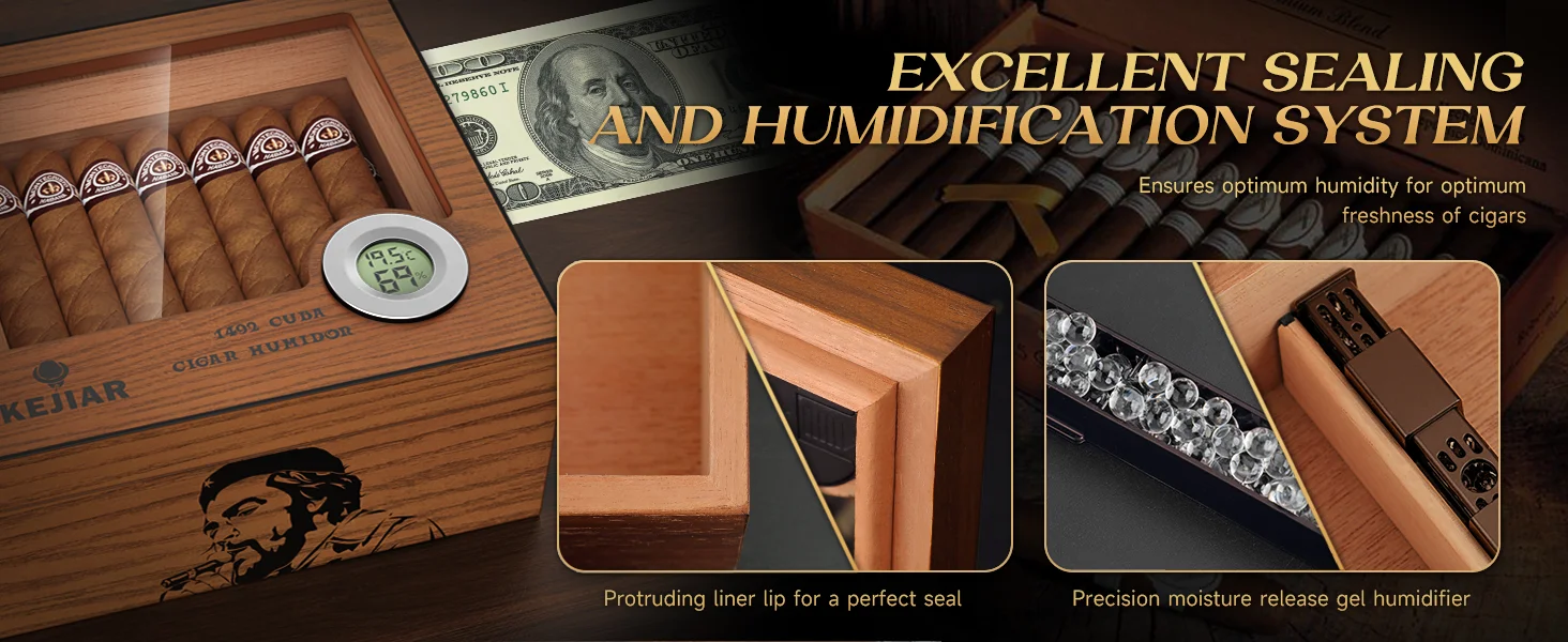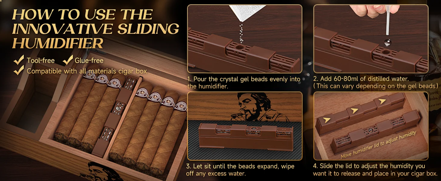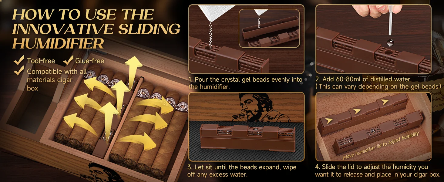 【Controlled Cigar Humidifier】Master the art of cigar preservation with our advanced cigar humidor humidifier system. The digital hygrometer pairs perfectly with the adjustable sliding cigar humidifier for cigar humidors, allowing you to fine-tune humidity levels (68-72%) for perfectly aged cigars to smoke. No more guesswork—just precision for optimal flavor and aroma. The crystal gel cigar humidifier is low-maintenance yet highly effective, making it a standout among cigar humidor accessories. Whether you’re aging premium cigars or enjoying a daily smoke, this small cigar humidor ensures every stick stays fresh as the day you bought it