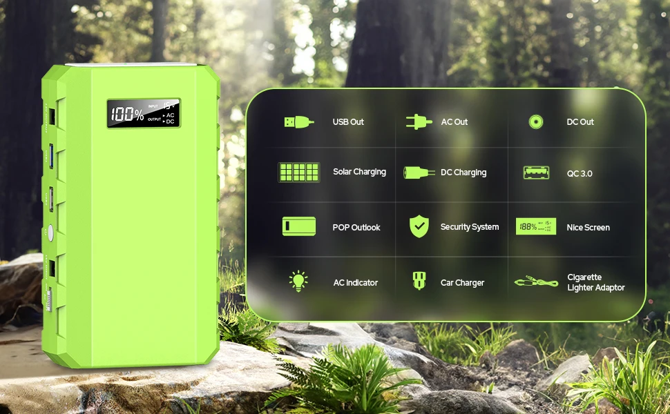 Our product includes QC3.0 9v/2A and 5V/3A two USB outputs, one 110V AC outlet, one DC 9~12.6V/10A (Max) output, which means this charger can power your multiple devices at once.