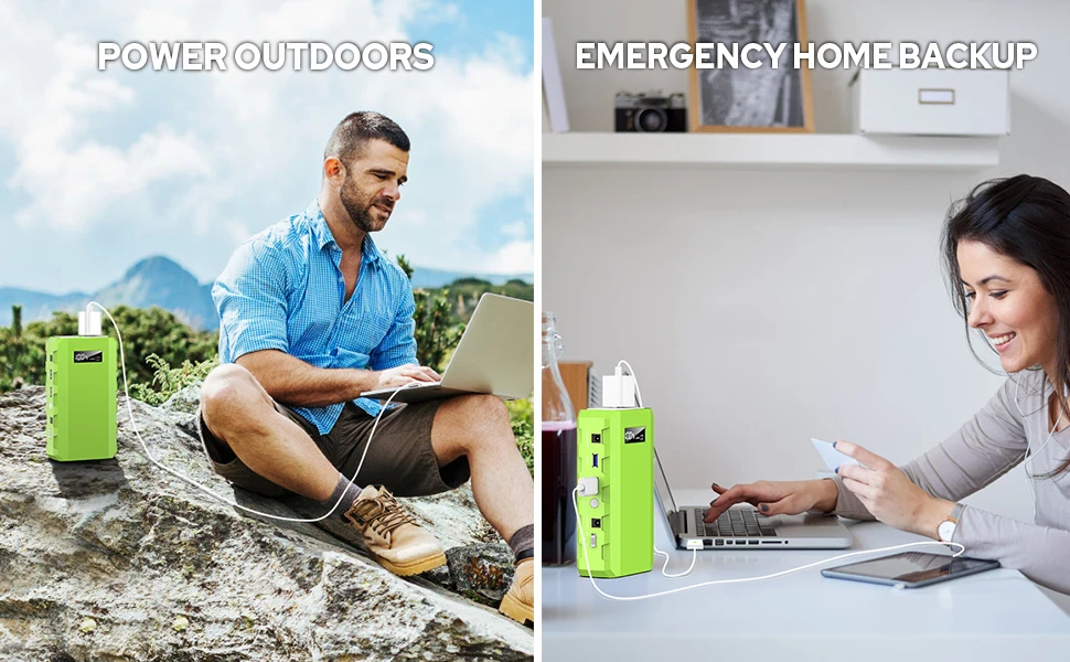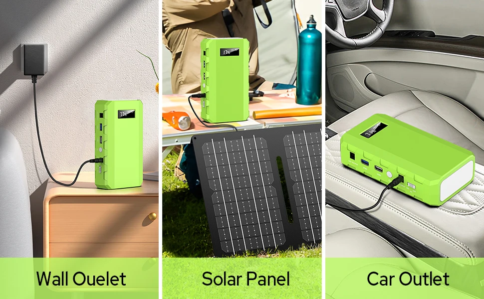 Powkey portable battery power station can be recharged by Home wall AC Outlet(DC 5521 input 15V/2A max). 12V cigarette lighter Adapter. Also It can Become Portable Solar Generator. Solar panel charging (solar panels not included)