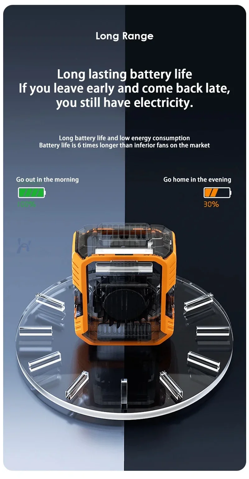 Battery life: about 23 hours for 1st gear, 12 hours for 2nd gear, 7 hours for 3rd fan