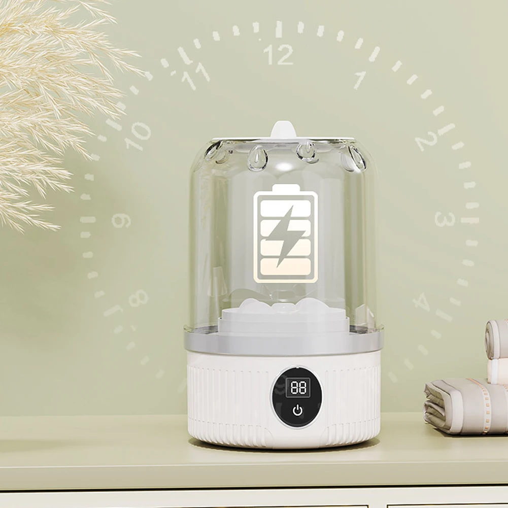 Features: 1. Compact and Portable: This cordless, rechargeable mini underwear washer is designed for on-the-go use, making it perfect for baby clothes, underwear, camping, or RV travel. Its lightweight and portable design ensures you can maintain cleanliness and freshness wherever your adventures take you. 2. Rechargeable Battery Power: Equipped with a 4000mAh rechargeable battery, this cordless small washing machine can handle up to 20 washes per charge, providing exceptional convenience. Its battery-powered operation means you can use it anywhere, without needing a constant power source, ideal for travel and outdoor activities. 3. Effective Cleaning Action: The automatic laundry cup's powerful yet gentle washing motion ensures your delicate garments are thoroughly cleaned. It combines efficiency with care, making it suitable for washing sensitive fabrics without causing damage, ensuring your clothes remain in excellent condition. 4. Space-Saving Design: Its compact size makes this portable washing machine easy to store and transport, making it a great choice for small living spaces or travel. Whether in a dorm, apartment, or while camping, its space-efficient design fits seamlessly into your lifestyle. 5. User-Friendly Operation: Featuring simple controls, this mini special washer is easy to use, providing a hassle-free laundry solution wherever you are. Its intuitive design allows for quick setup and operation, ensuring you can wash clothes with ease, no matter your location. Specification: Origin: Mainland China Capacity: 1 liter Special topic: laundry Access location: front loading Power source: rechargeable battery