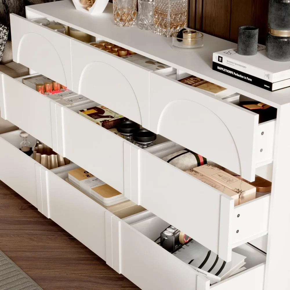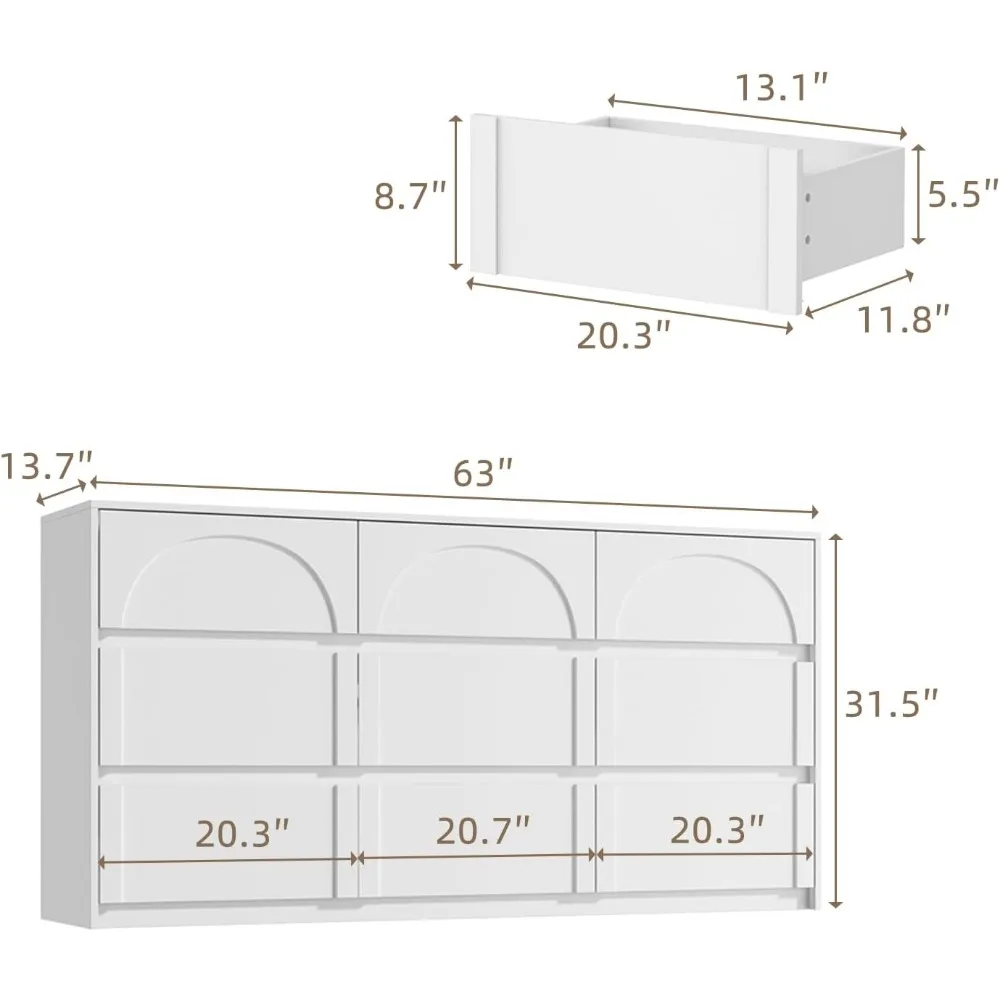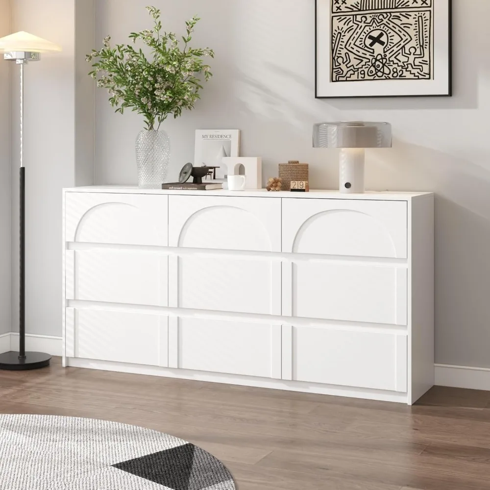 9 Drawer Dresser Chest of Drawers, Modern White Dresser for Bedroom, 63” Wide Drawer Chest, No Handles, Arch-Shape Pattern, 9 Dr